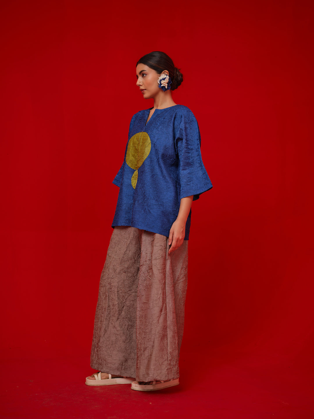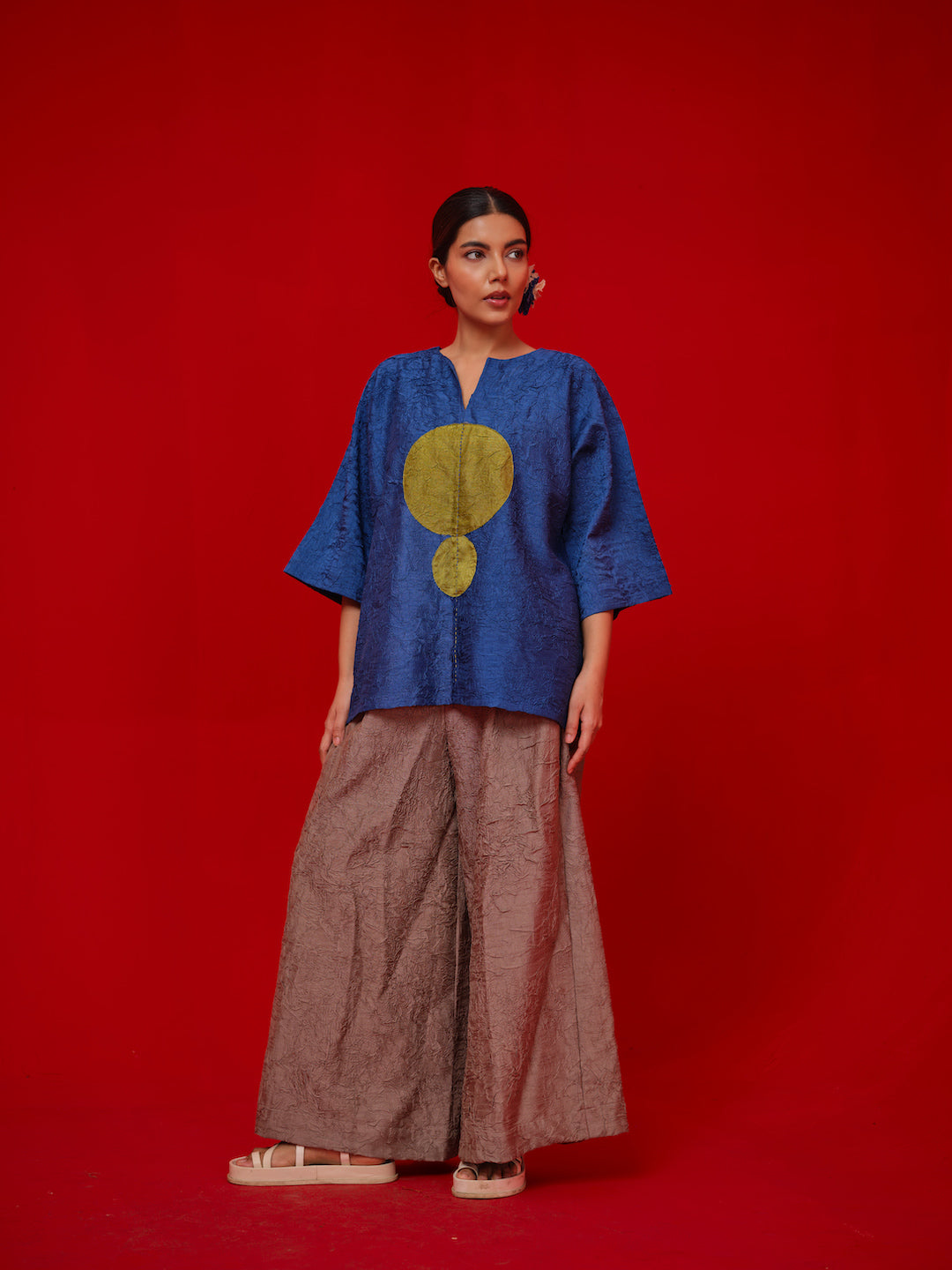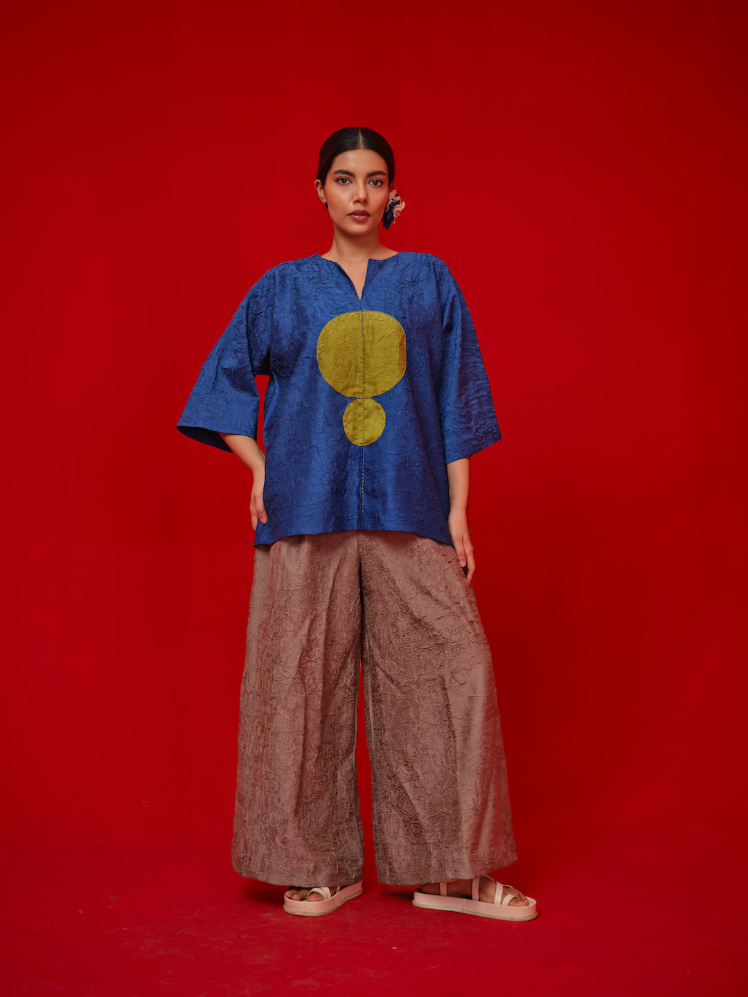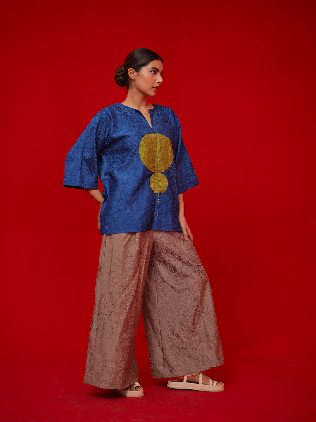A one-size, free-flowing top crafted in hand-crushed silk. Designed with a contrasting circular appliqué and finished with delicate Kantha stitching for added detail.