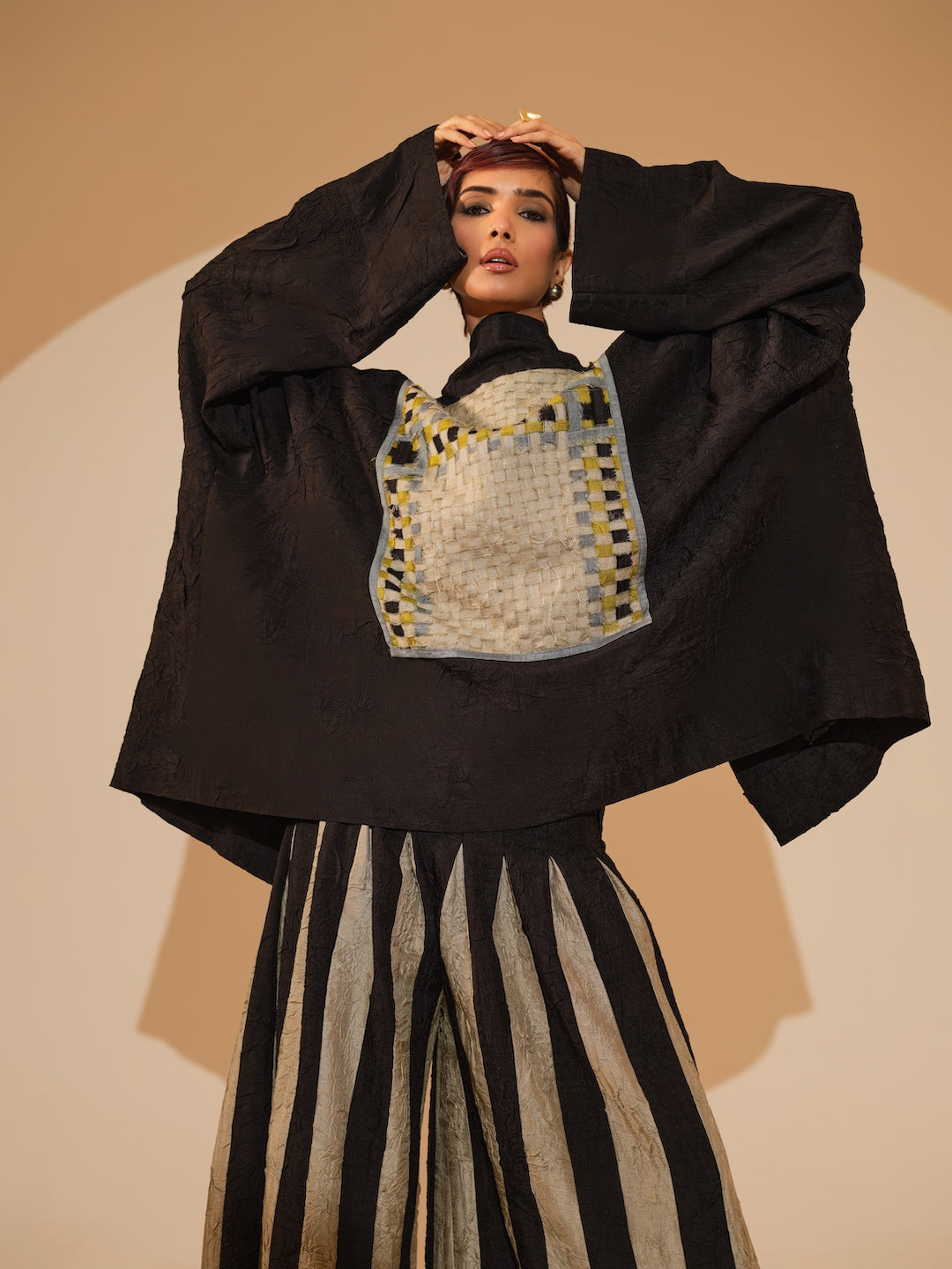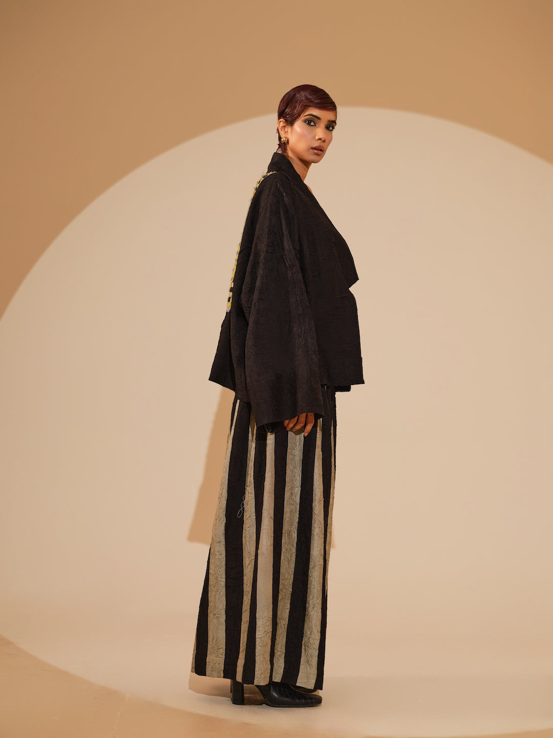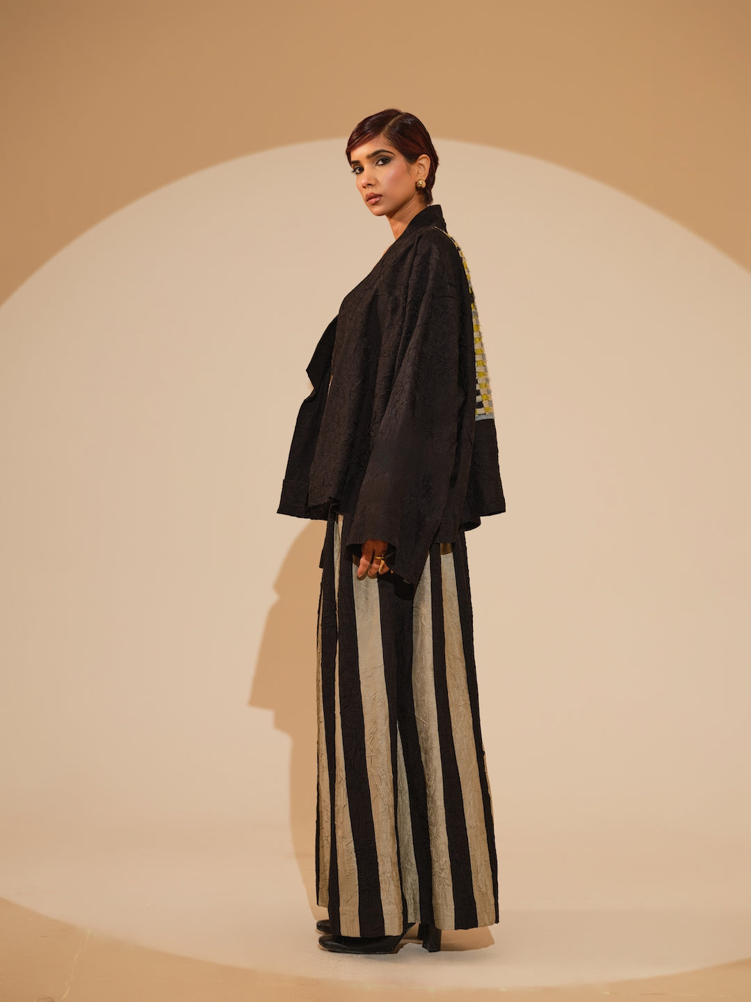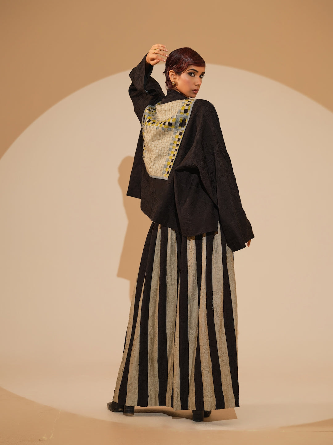 An oversized jacket crafted in our signature crushed silk, featuring an intricately hand-woven patch at the back — a subtle statement of detail and texture.Relaxed shirt style featuring a sophisticated overlap design and exquisite fabric buttons. Each piece is meticulously adorned with hand-sewn appliqué, paired with hand crushed flared trousers, pieced together to create stripes by artisans in house.