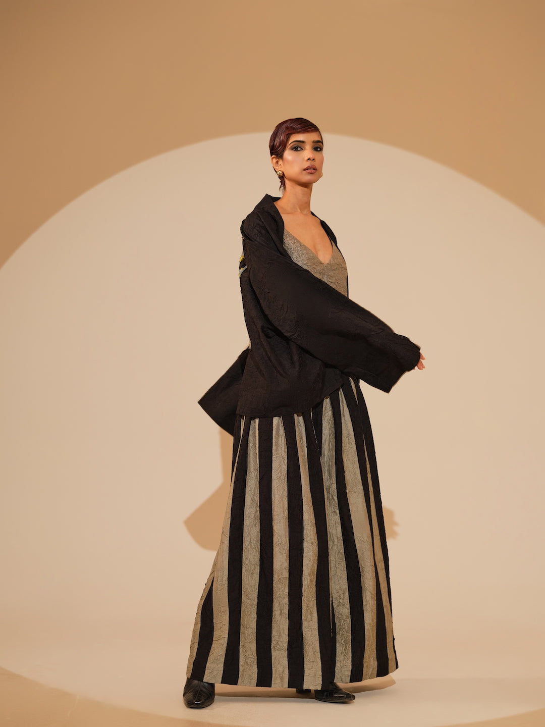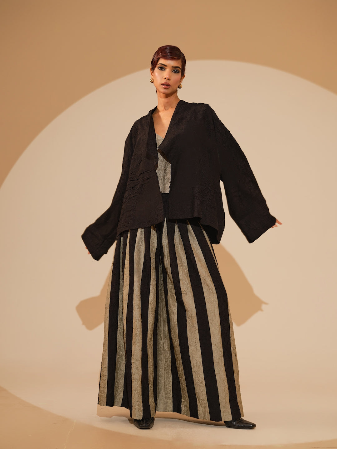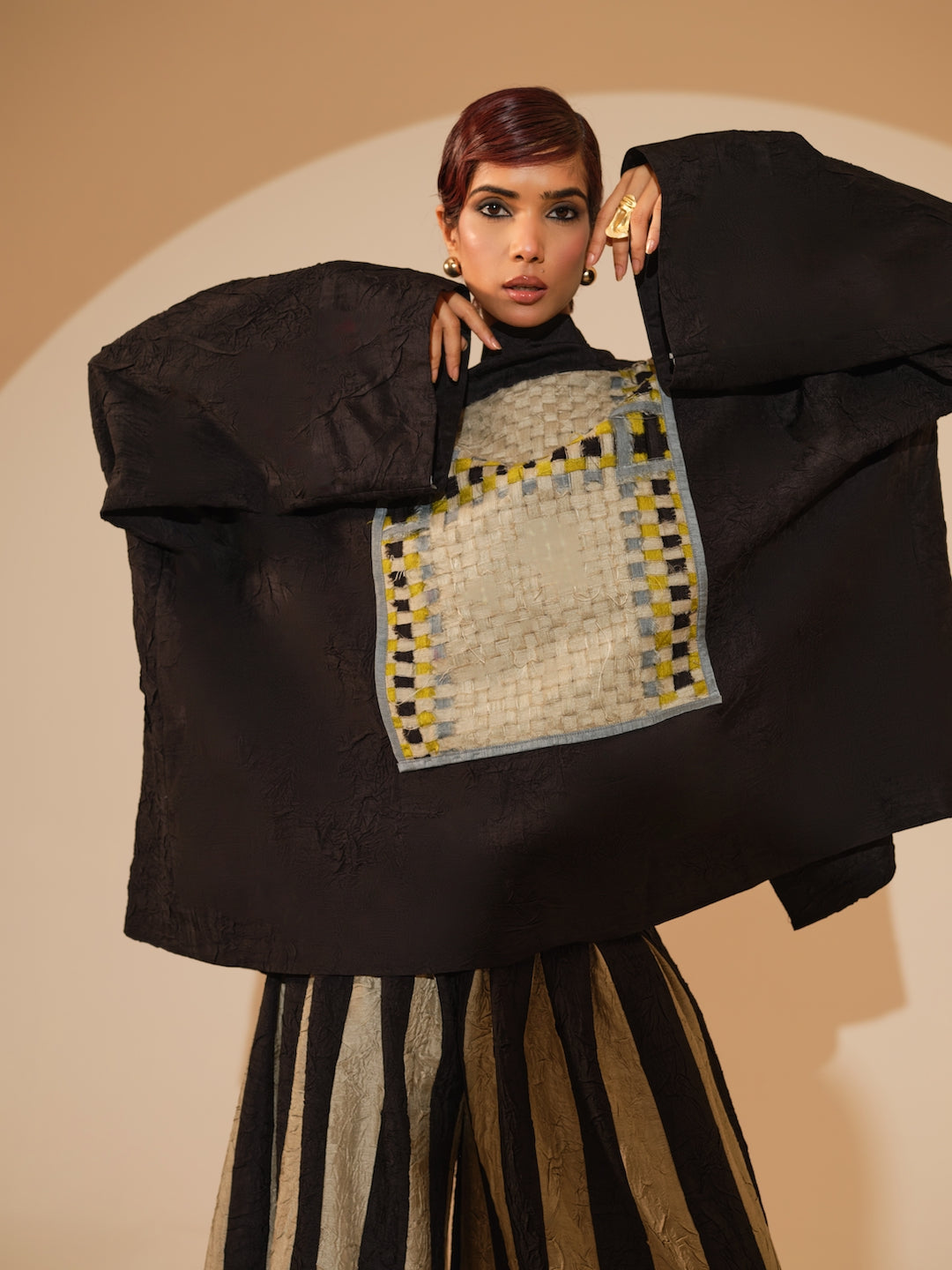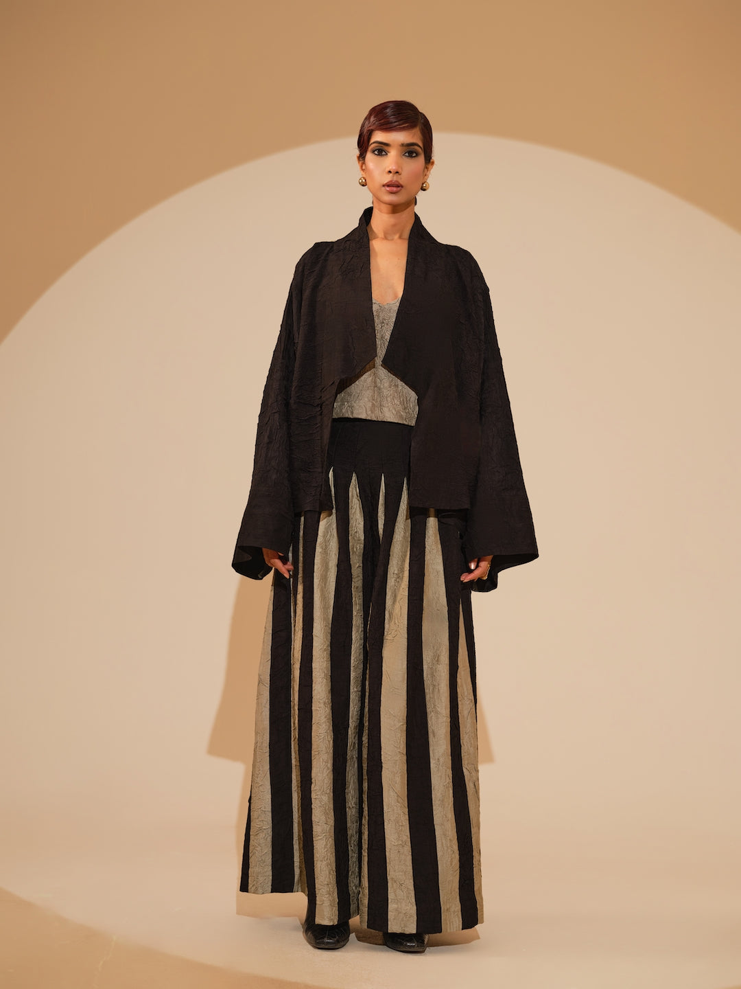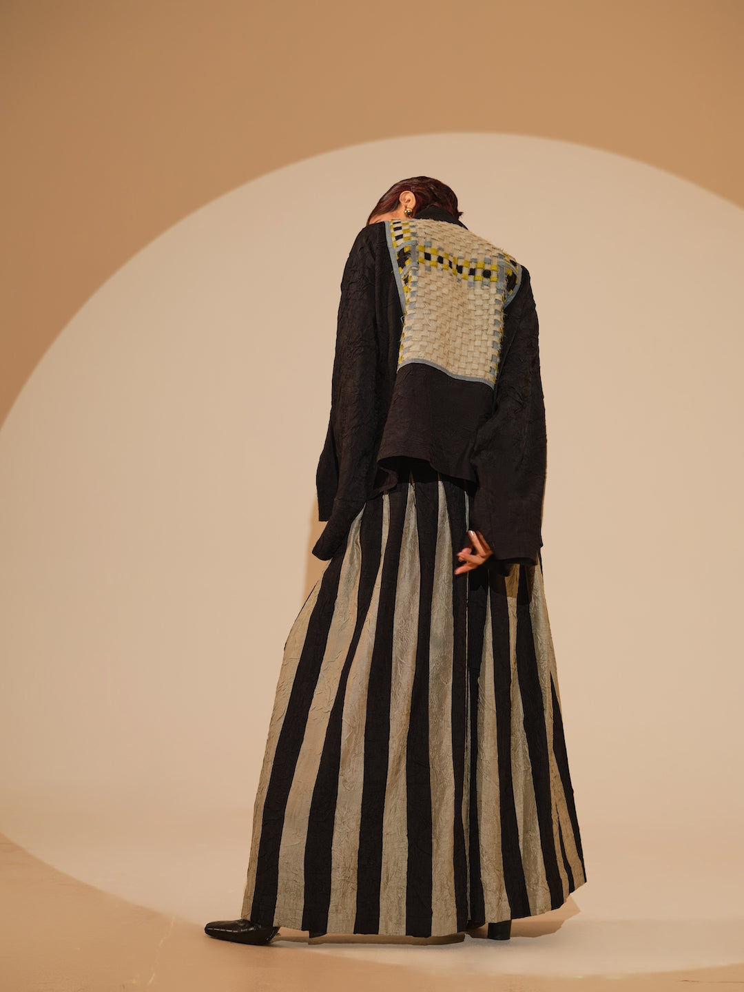 An oversized jacket crafted in our signature crushed silk, featuring an intricately hand-woven patch at the back — a subtle statement of detail and texture.Relaxed shirt style featuring a sophisticated overlap design and exquisite fabric buttons. Each piece is meticulously adorned with hand-sewn appliqué, paired with hand crushed flared trousers, pieced together to create stripes by artisans in house.