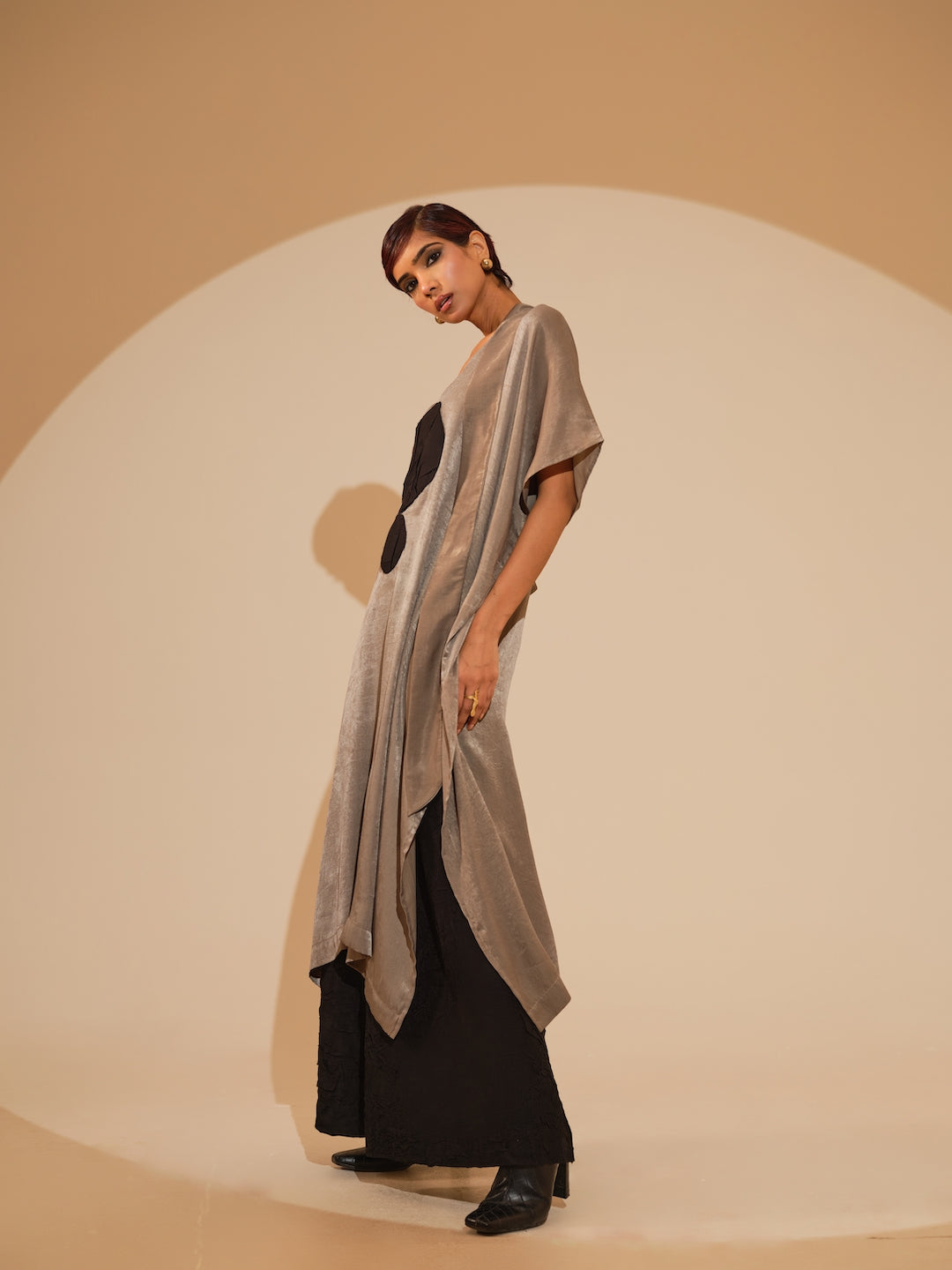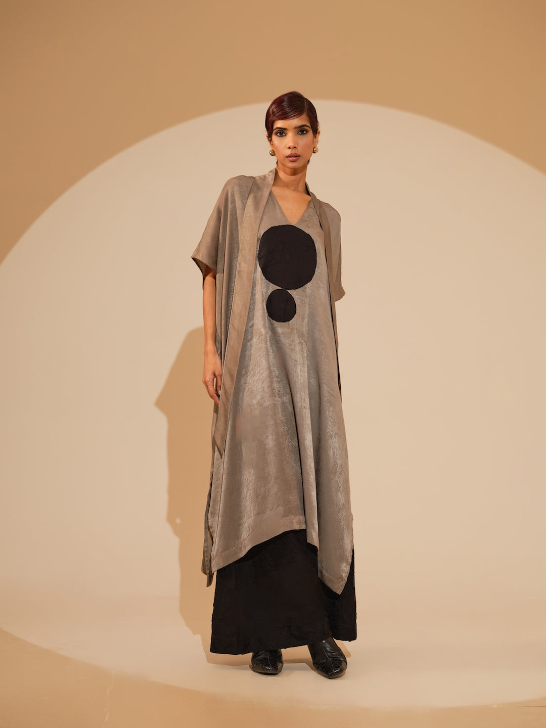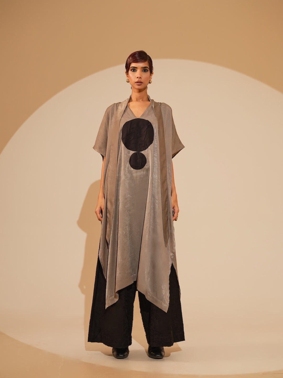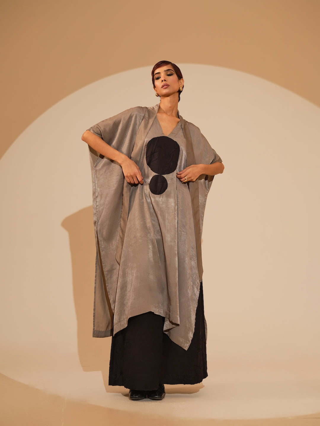 A relaxed, one-size kaftaan made in velvet silk, light in weight and features a soothing shine mimicking velvet. It features a tie up around the neck and a hand sewn ciruclar applique in the centre. Paired with flared trousers made in silk, crushed in house by artisans. The trousers have an elacticated waistband for ease and comfort