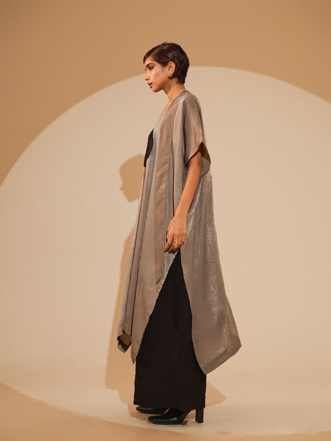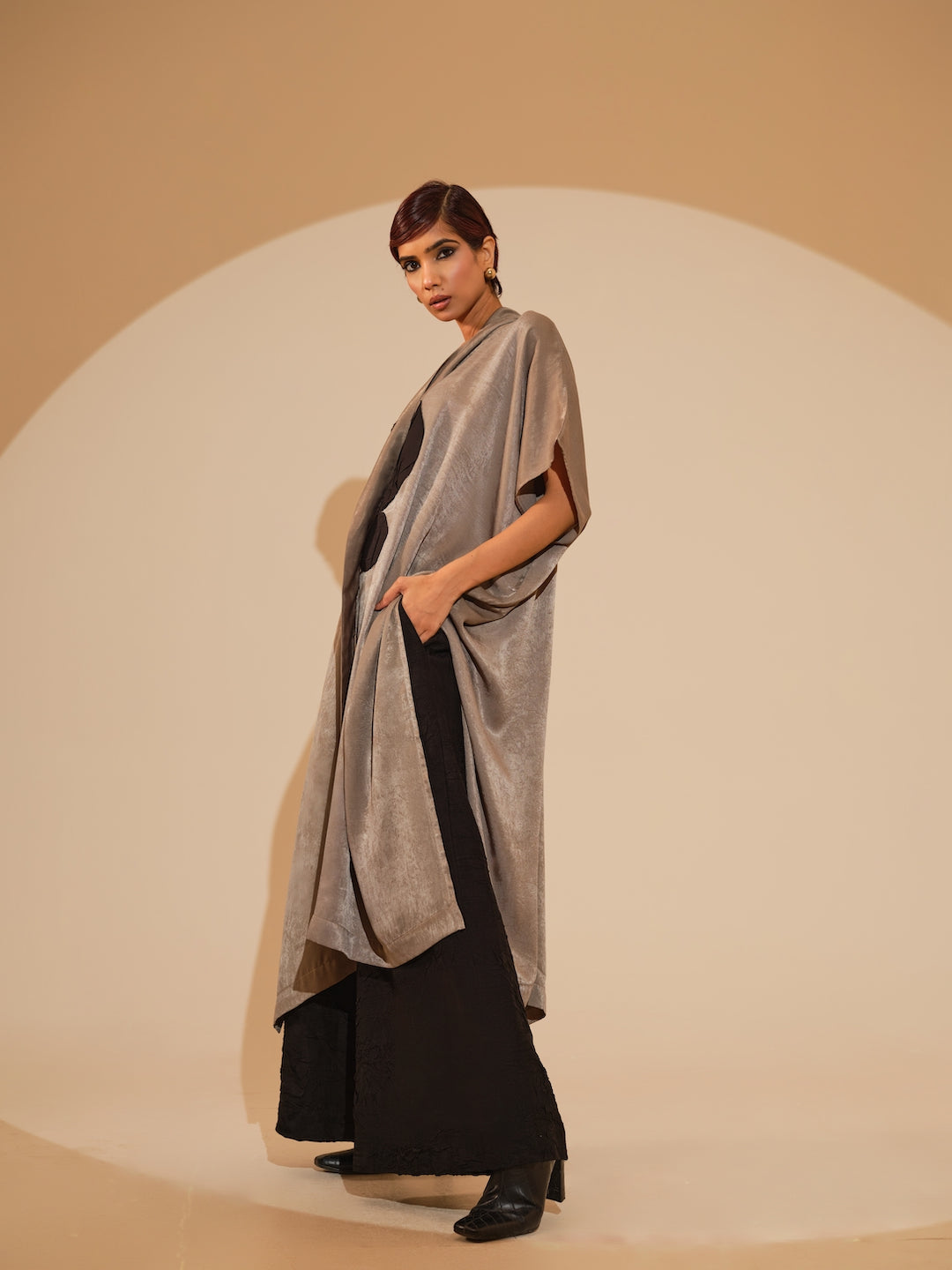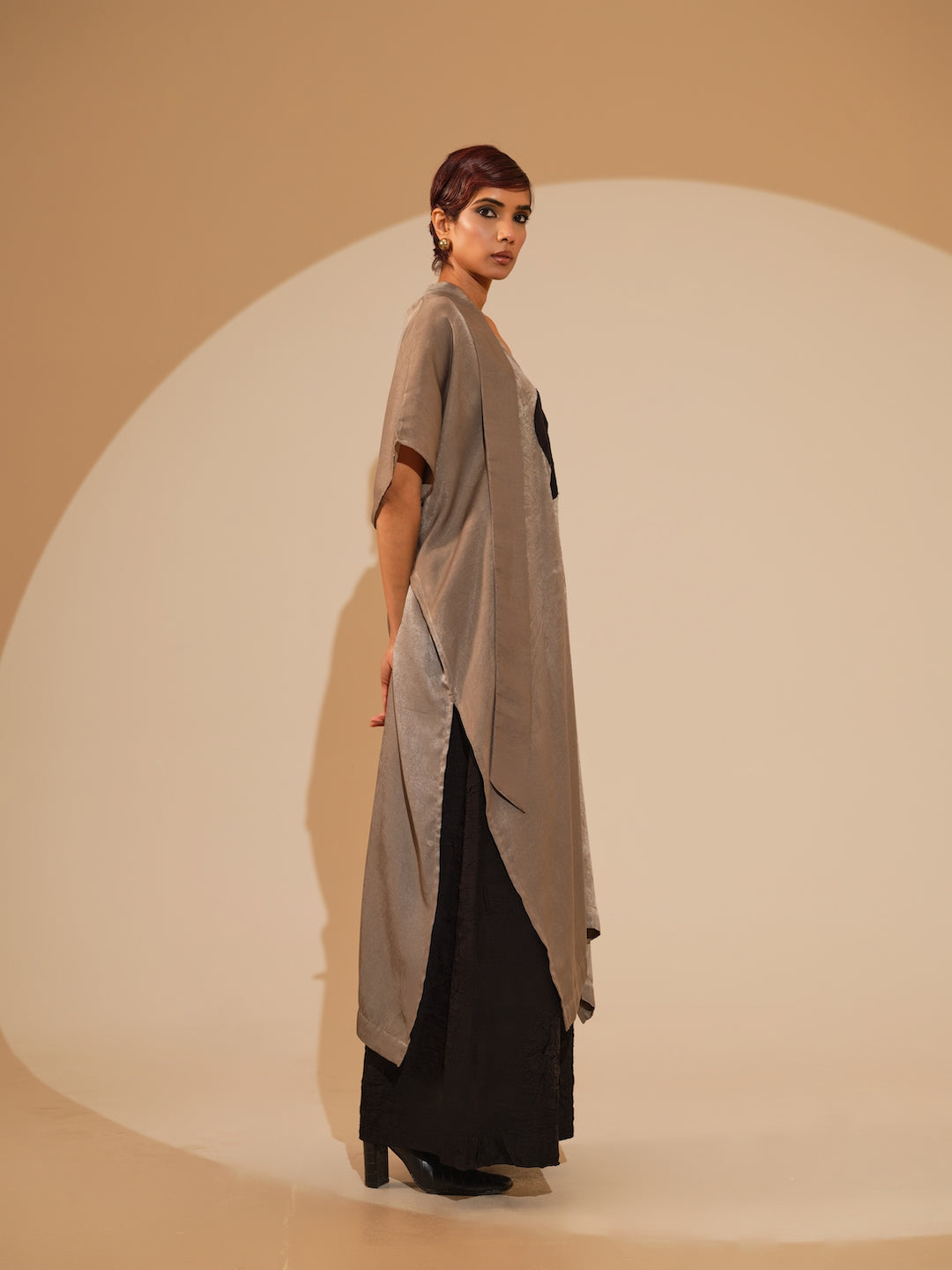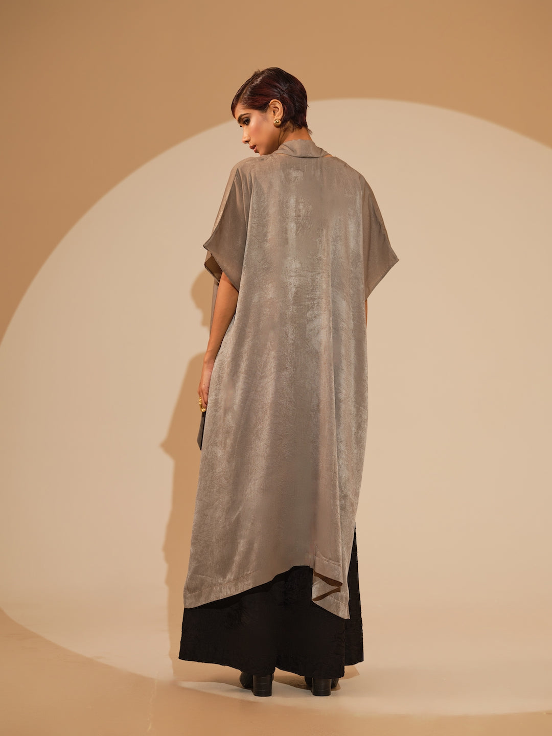 A relaxed, one-size kaftaan made in velvet silk, light in weight and features a soothing shine mimicking velvet. It features a tie up around the neck and a hand sewn ciruclar applique in the centre. Paired with flared trousers made in silk, crushed in house by artisans. The trousers have an elacticated waistband for ease and comfort