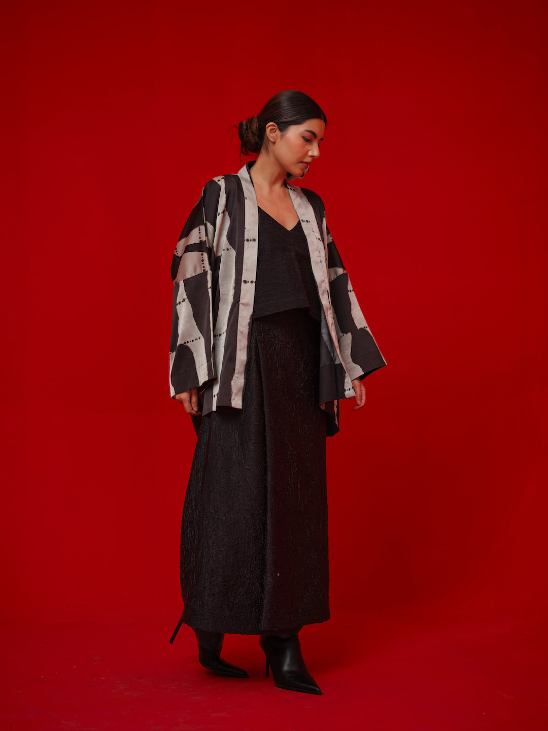 Kimono-style overlay crafted in premium satin with an in-house digital print. Designed in an oversized silhouette for an effortless, statement look.