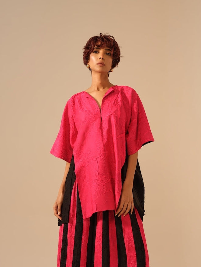 Crafted in hand-crushed silk, the top is designed in striking pink and black tones that highlight its bold color-blocked silhouette. The relaxed yet structured fit offers ease while subtly shaping the body, creating a naturally refined look. Hand-embroidered fine stitch details trace the seams, reflecting the craftsmanship and character.