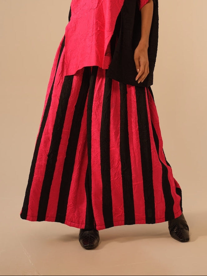 Relaxed yet sculptural, these flared trousers are crafted in hand-crushed silk in striking tones of pink and black. Each pair is meticulously stitched and crushed in-house, highlighting the brand’s artisanal process. The waistband features delicate hand-sewn pleats that play with shadow and light, enhancing movement and form. Finished with a full belt and zip closure for a seamless fit.