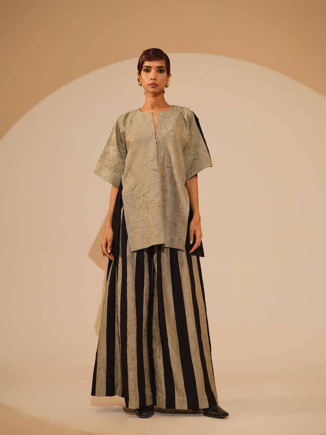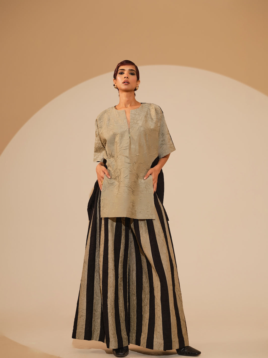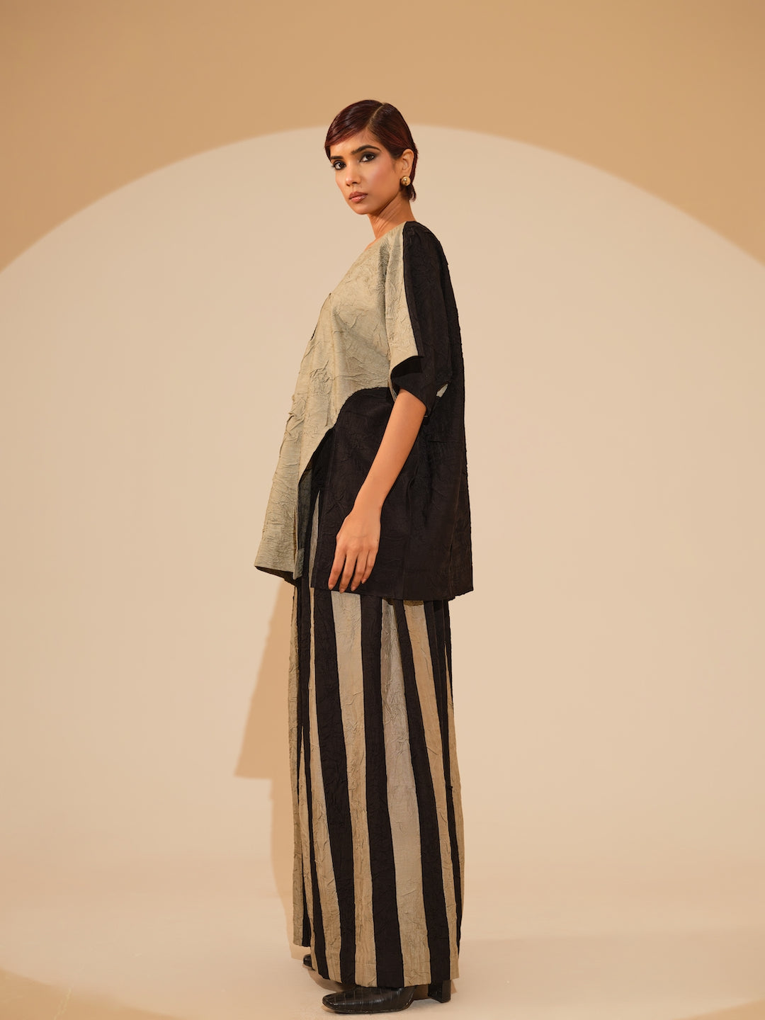 Crafted in hand-crushed silk, features a relaxed yet structured fit offers ease while subtly shaping the body, creating a naturally refined look. Hand-embroidered fine stitch details trace the seams, reflecting the craftsmanship and character. Paired with a flared trouser in crushed silk, meticulously patchworked together to create the stripes.