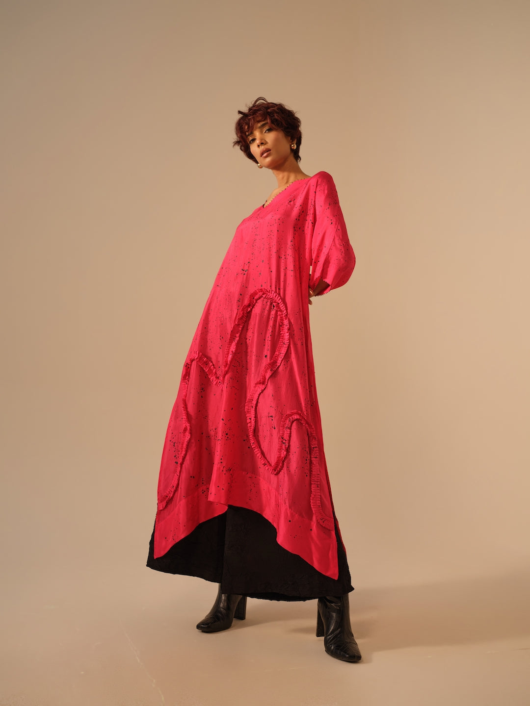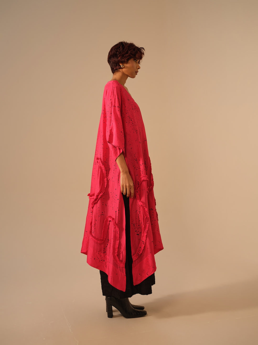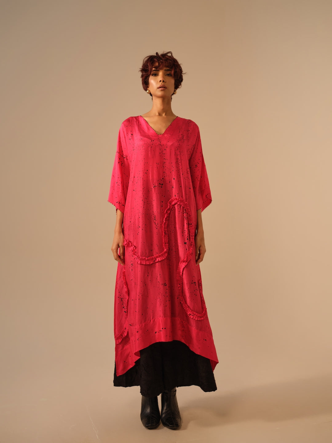 This tunic is crafted in lightweight silk with a kaftan-inspired cut that flatters all body types. The fluid silhouette is adorned with hand-sewn ruffles in a matching tone, each delicately stitched by our artisans. Effortless and versatile, it captures the balance between ease, craftsmanship, and timeless form.