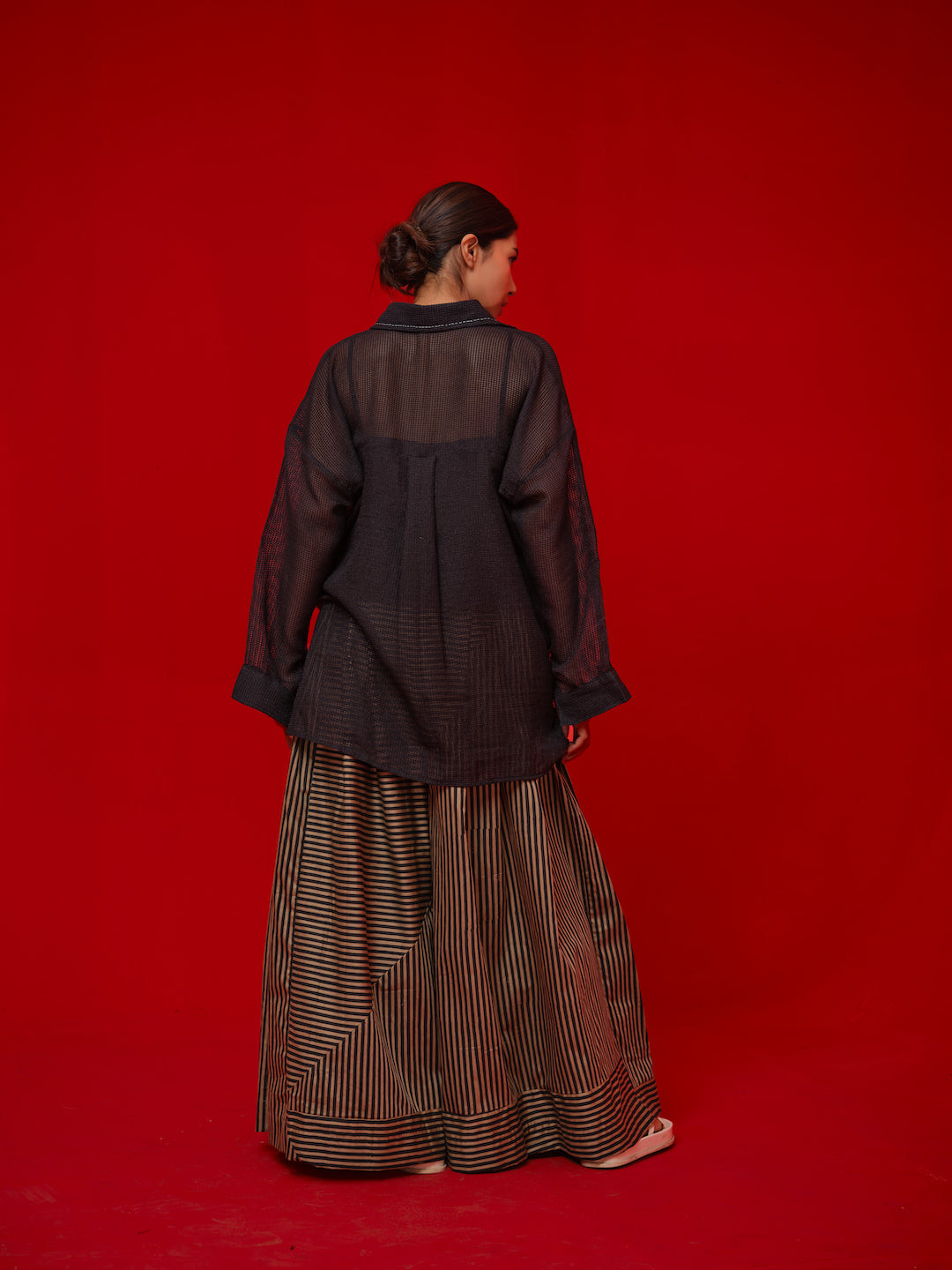 Flared trousers crafted in rich Italian cotton with hand block-printed stripes. Designed with random patchwork for an asymmetric stripe placement.