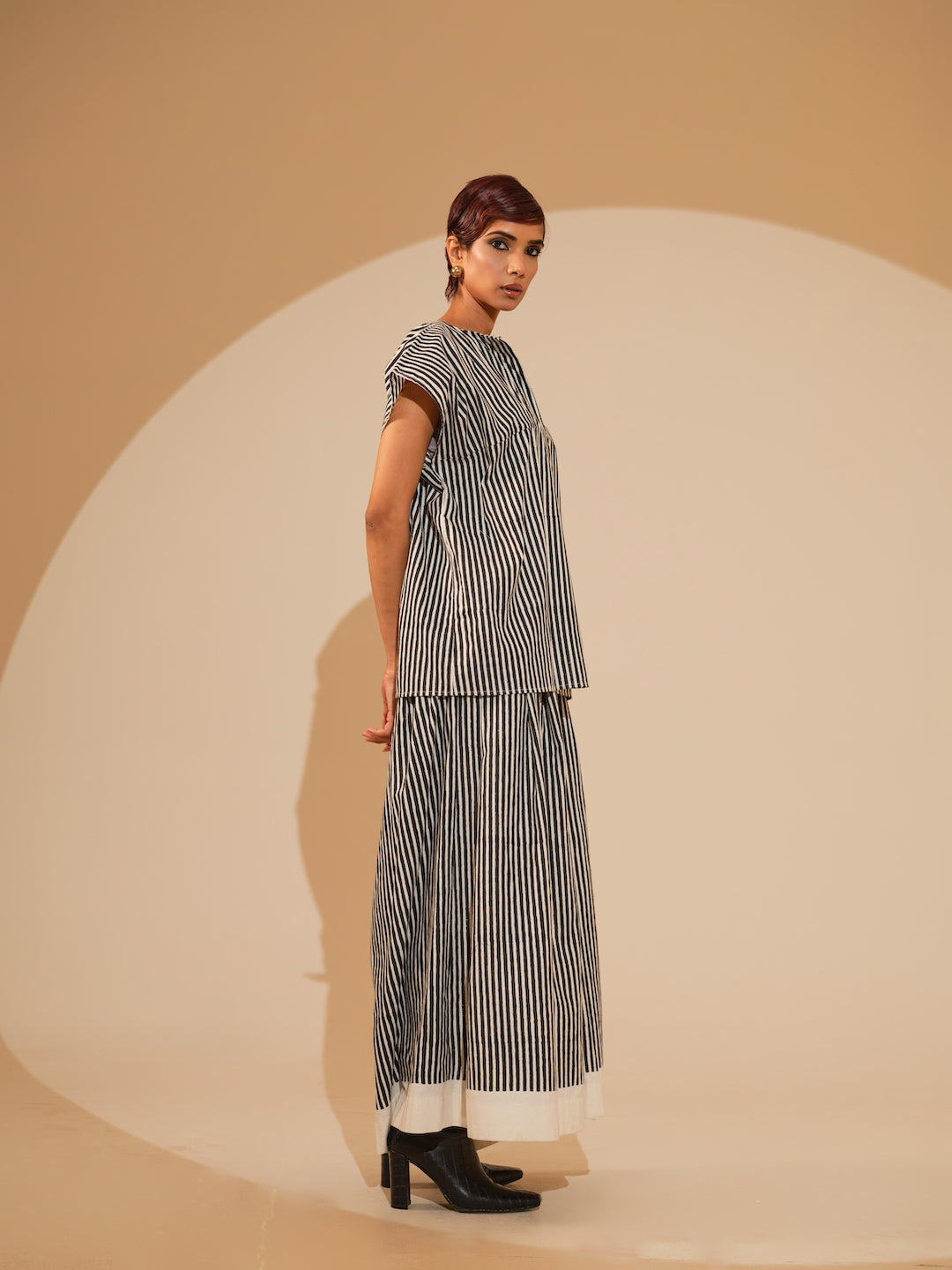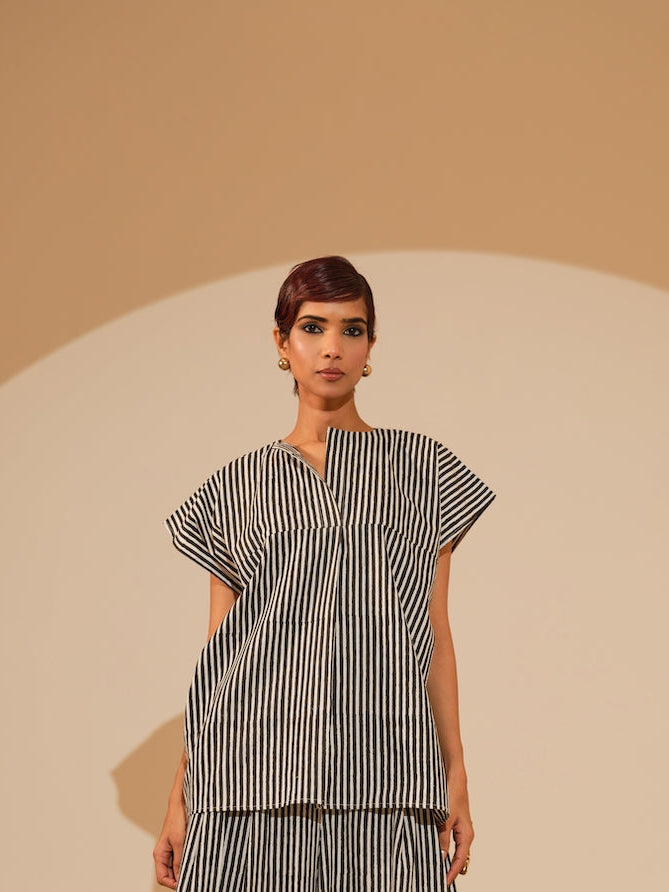 An oversized, free-flowing top with hand block-printed stripes — shifting between structure and ease, like currents in motion.Paired with pleated anf flared trousers in hand block printed stripes.