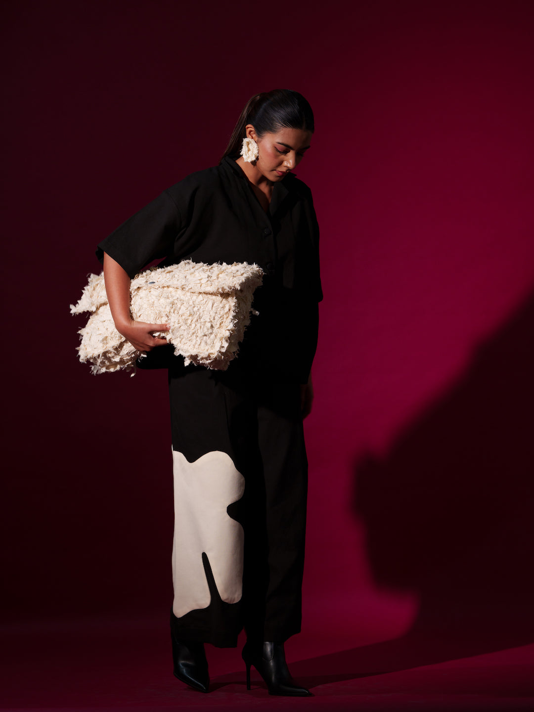 Relaxed shirt style featuring a sophisticated overlap design and exquisite fabric buttons. Each piece is meticulously adorned with hand-sewn appliqué, adding a touch of artistry to your wardrobe.