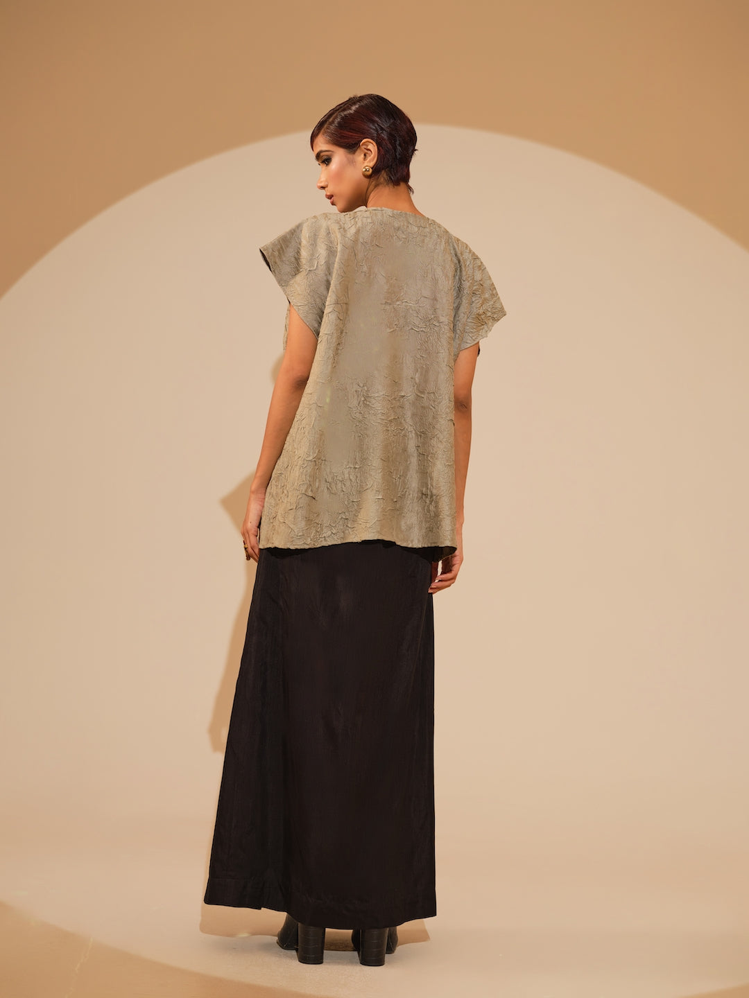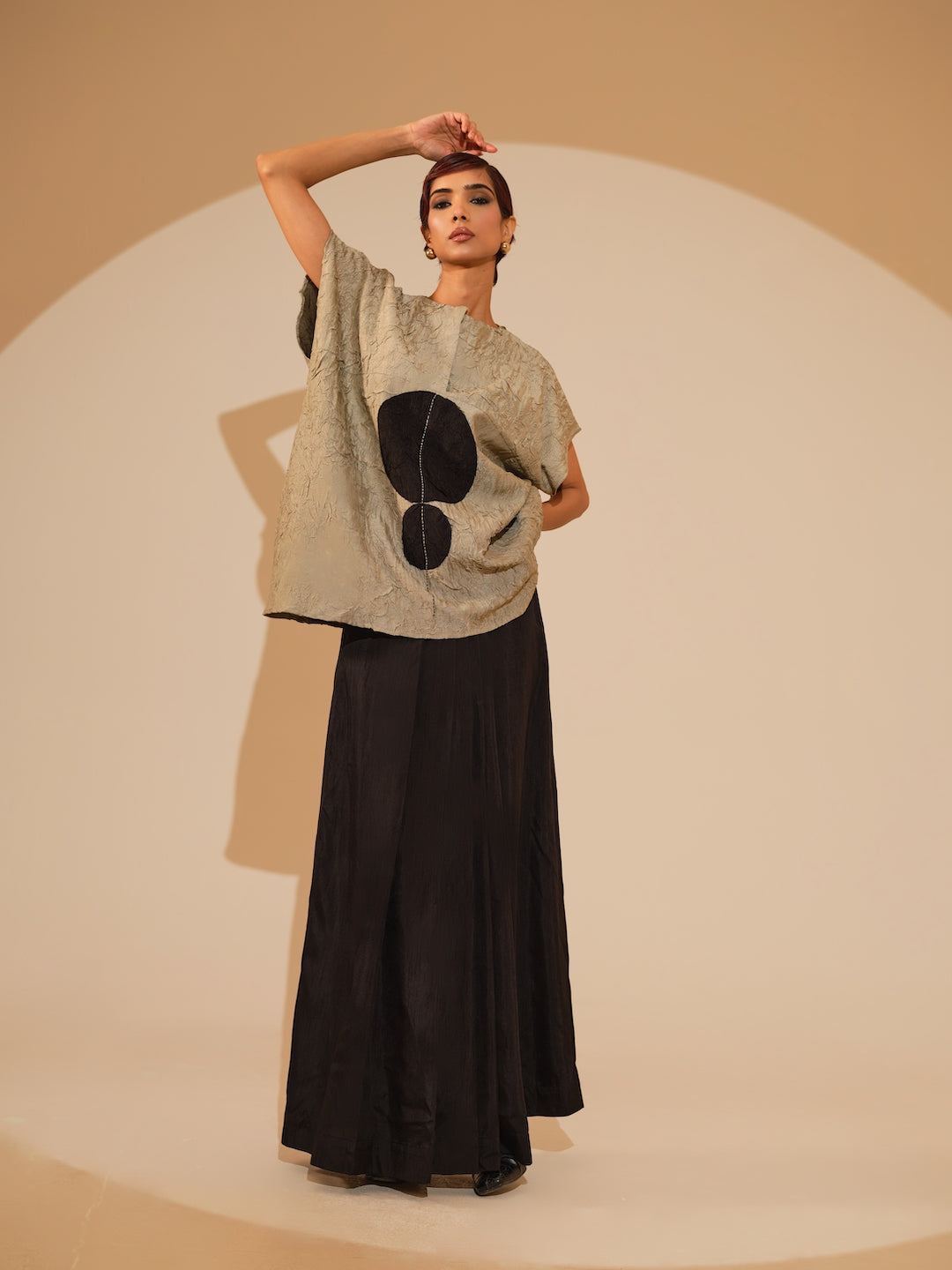 A one-size top crafted in hand-crushed silk, made in-house for its unique texture and fluid drape. It features a hand-embroidered circular appliqué rendered in traditional Kantha stitching each motif individually crafted by our artisans. The top is paired with a saree size pleated skirt made in silk.