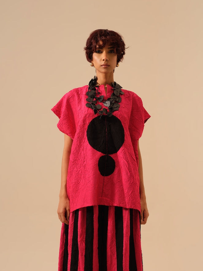 A one-size top crafted in hand-crushed silk, made in-house for its unique texture and fluid drape. It features a hand-embroidered circular appliqué rendered in traditional Kantha stitching each motif individually crafted by our artisans. The relaxed silhouette and artisanal detail make it a statement of ease and craftsmanship.