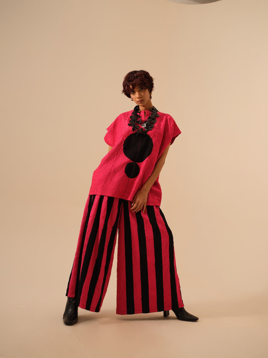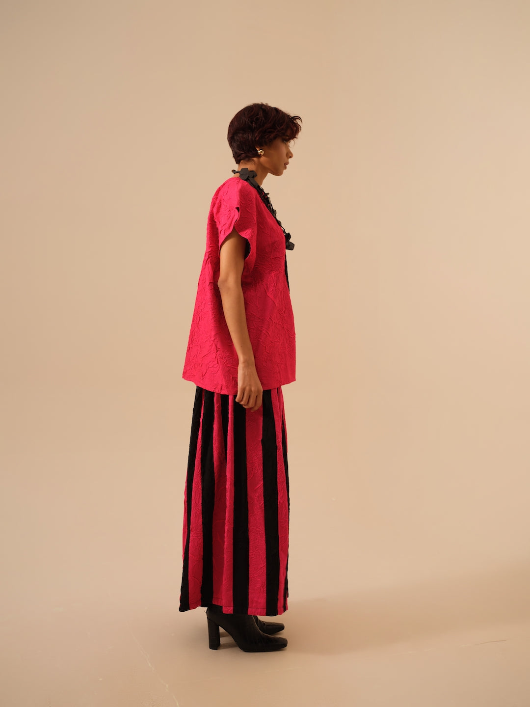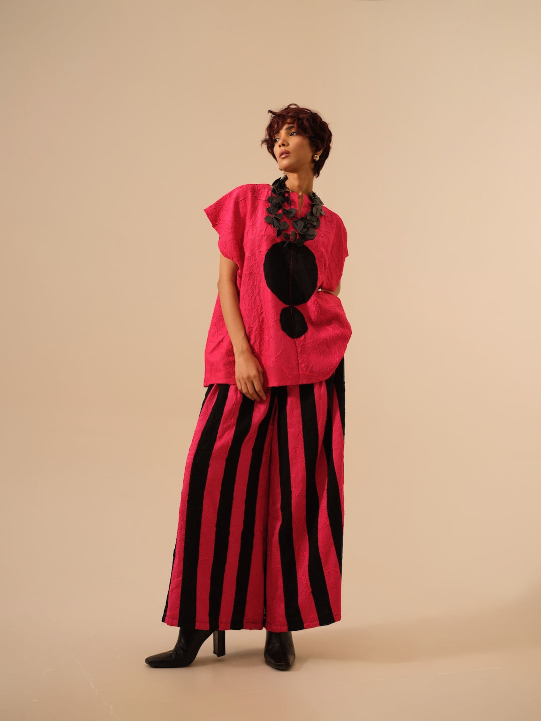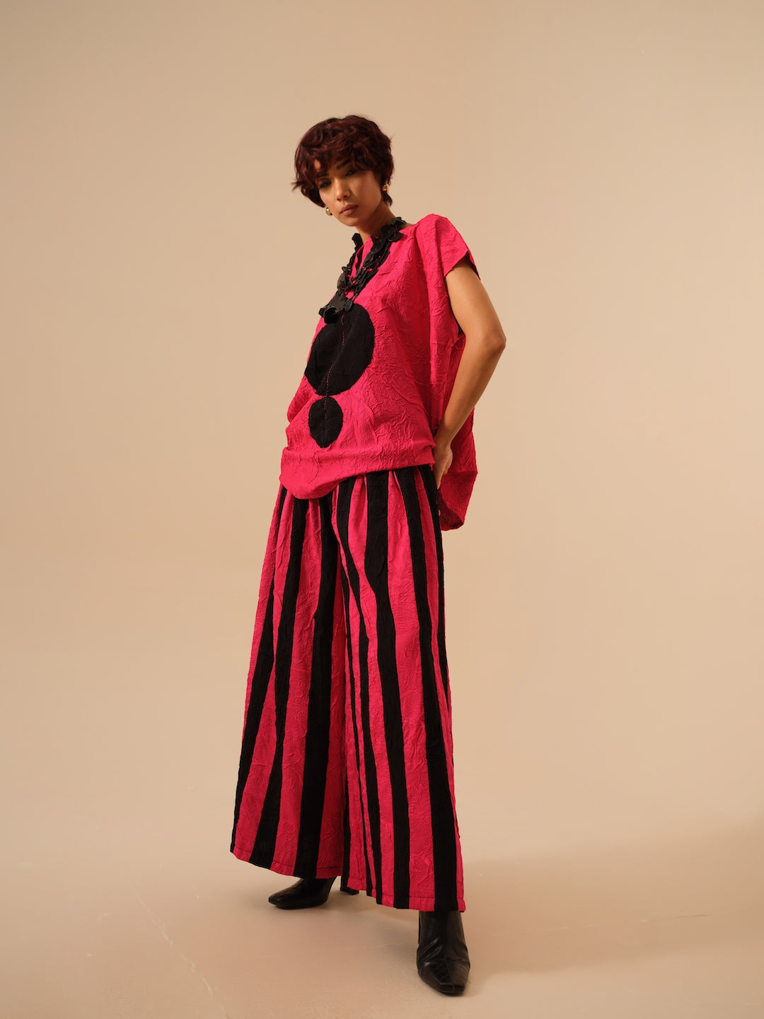Relaxed yet sculptural, these flared trousers are crafted in hand-crushed silk in striking tones of pink and black. Each pair is meticulously stitched and crushed in-house, highlighting the brand’s artisanal process. The waistband features delicate hand-sewn pleats that play with shadow and light, enhancing movement and form. Finished with a full belt and zip closure for a seamless fit.