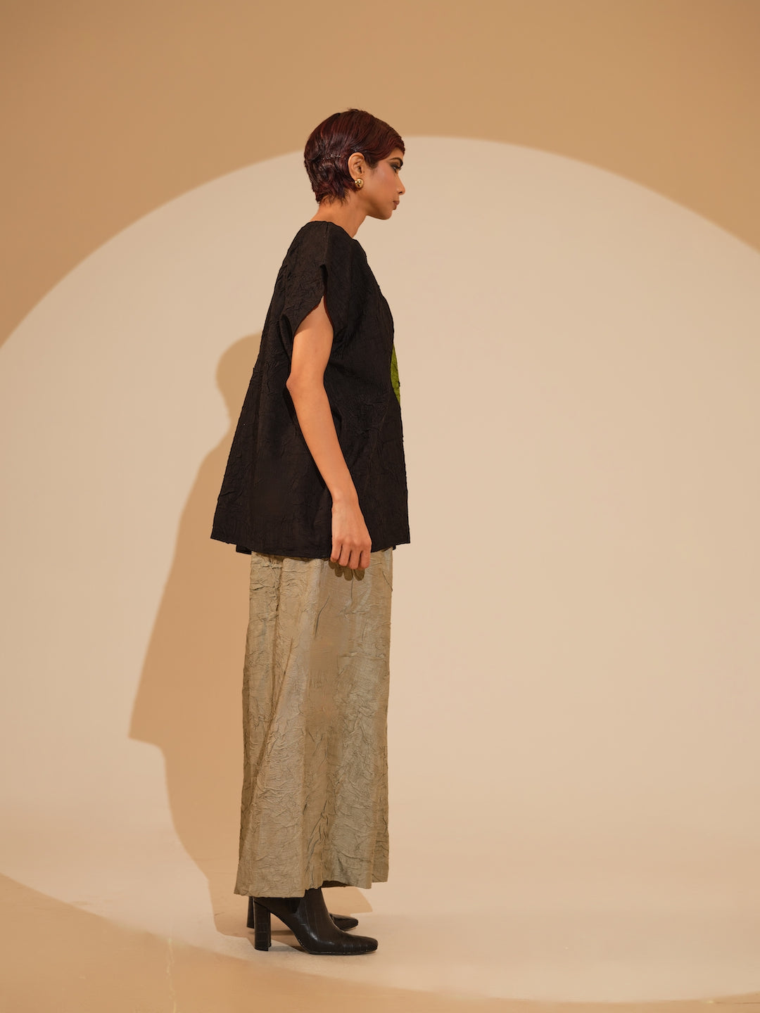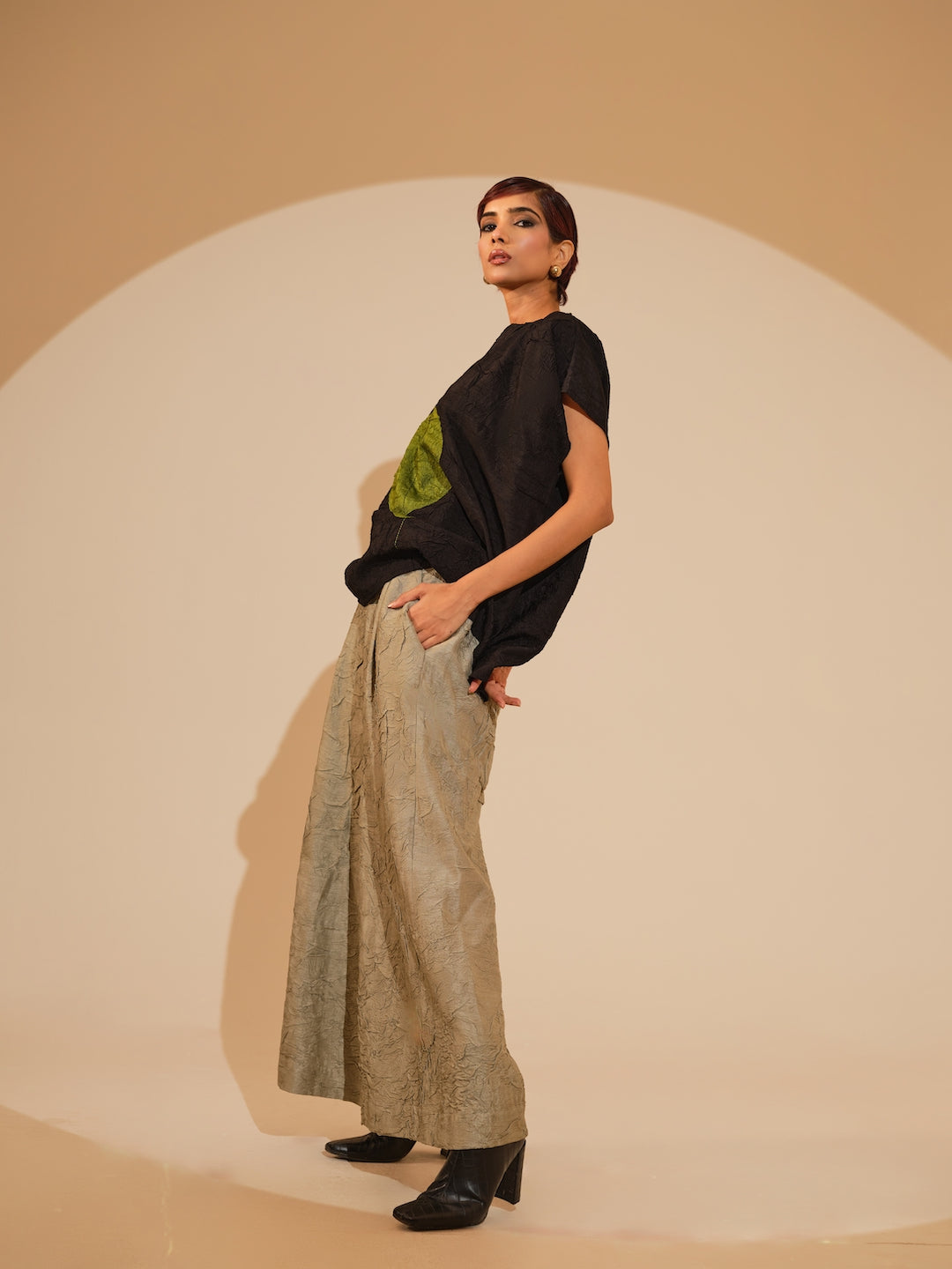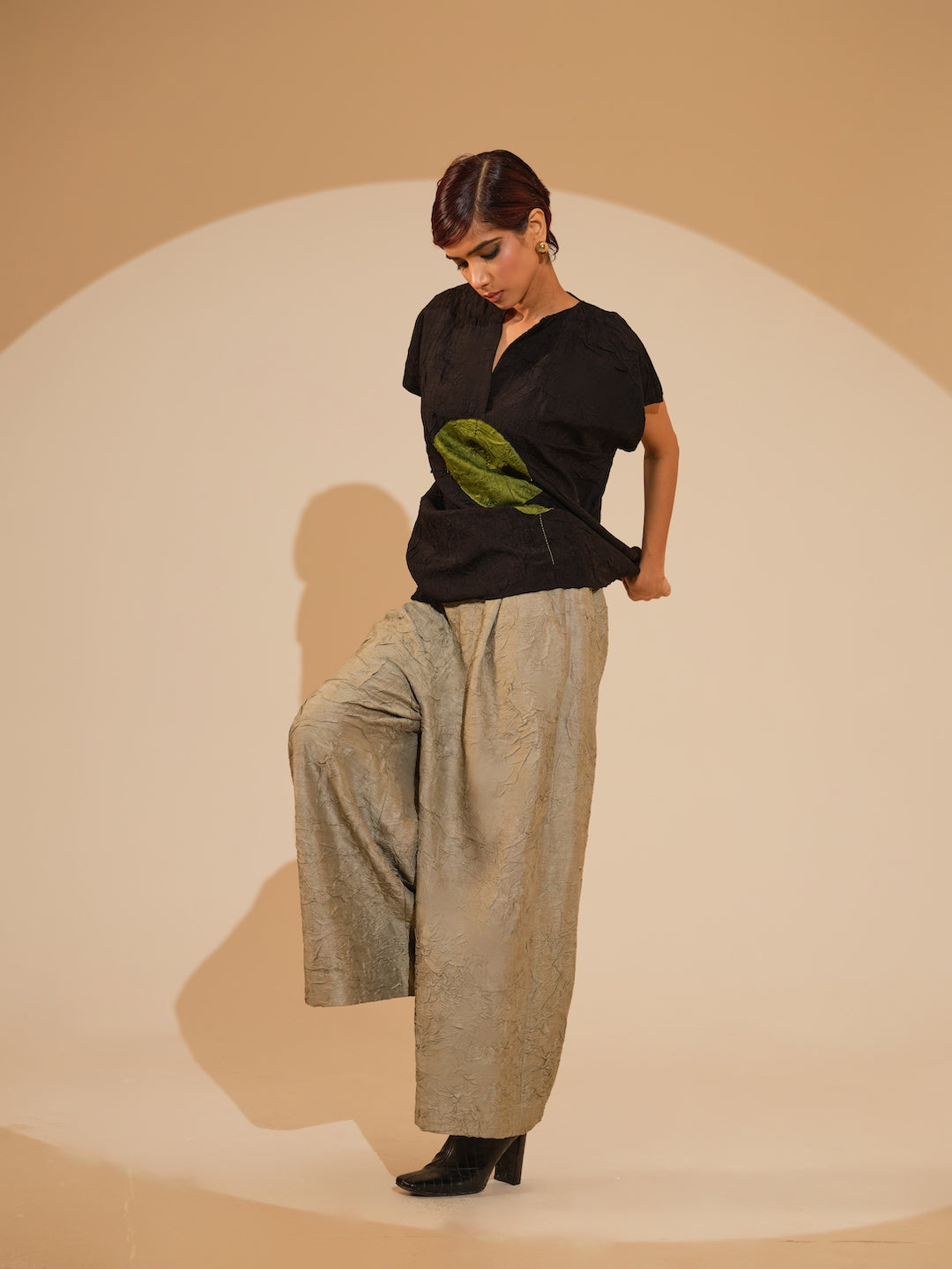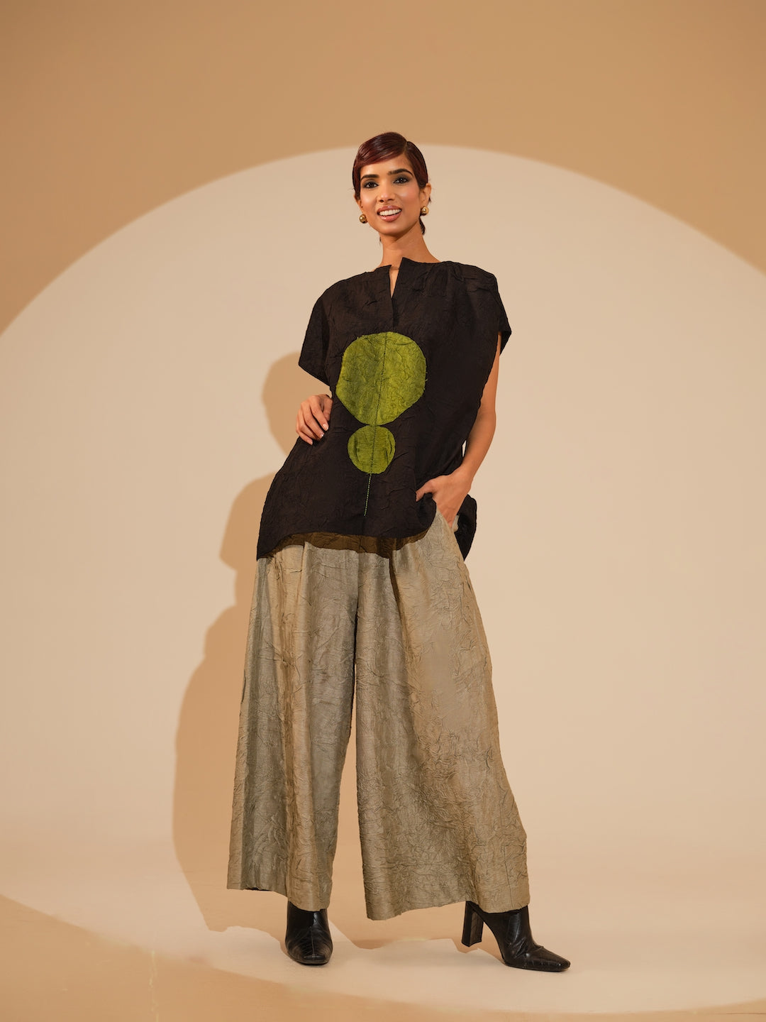 A one-size top crafted in hand-crushed silk, made in-house for its unique texture and fluid drape. It features a hand-embroidered circular appliqué rendered in traditional Kantha stitching each motif individually crafted by our artisans. Paired with flared an relaxed trousers made in silk, crushed in house by artisans. It features an elasticated waistband for ease and comfort.