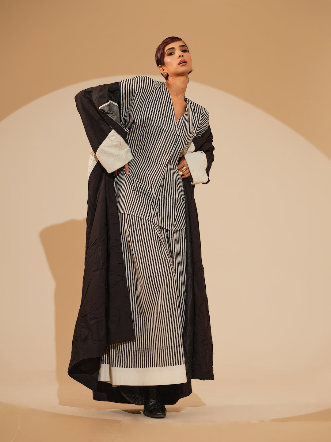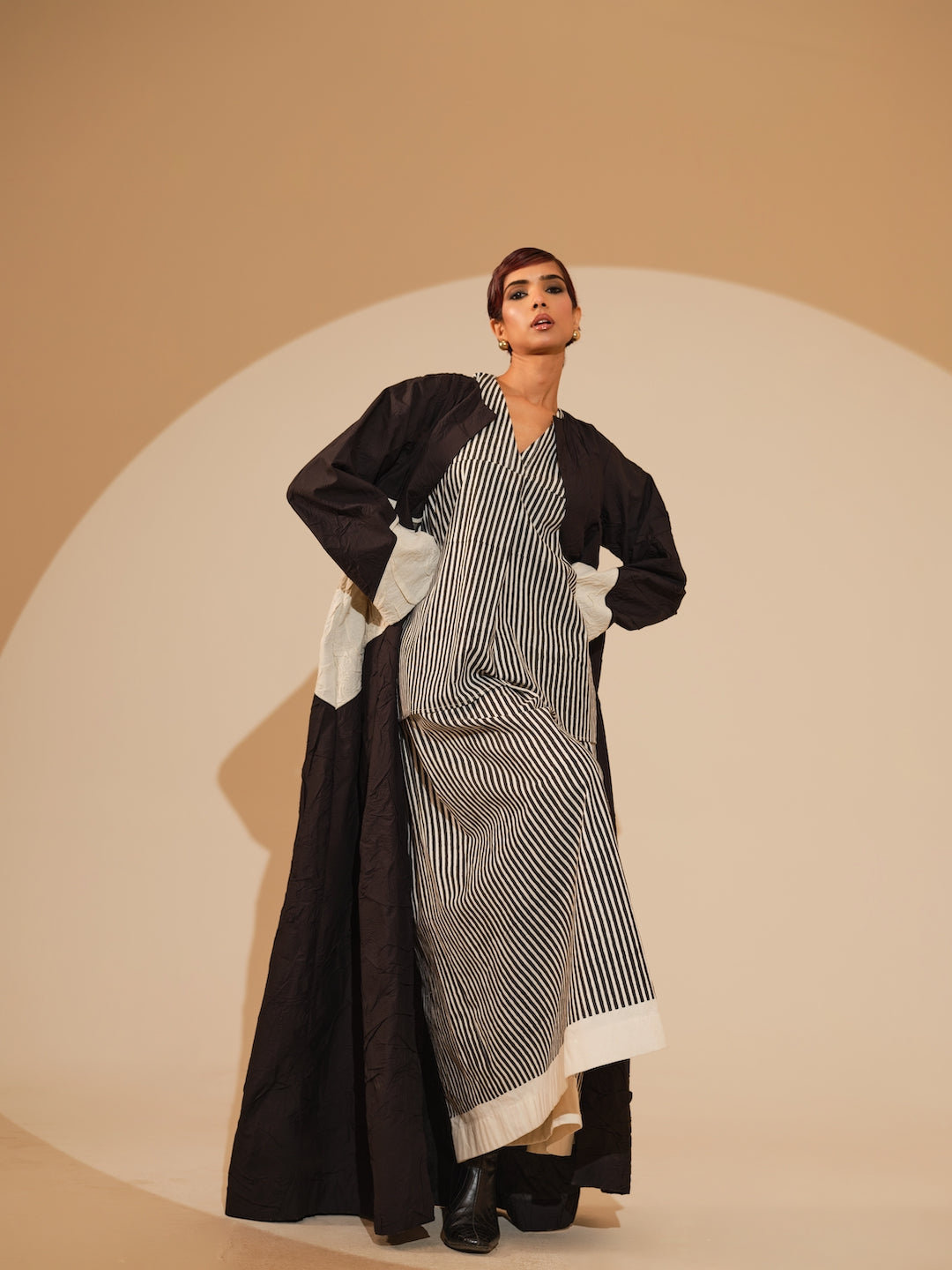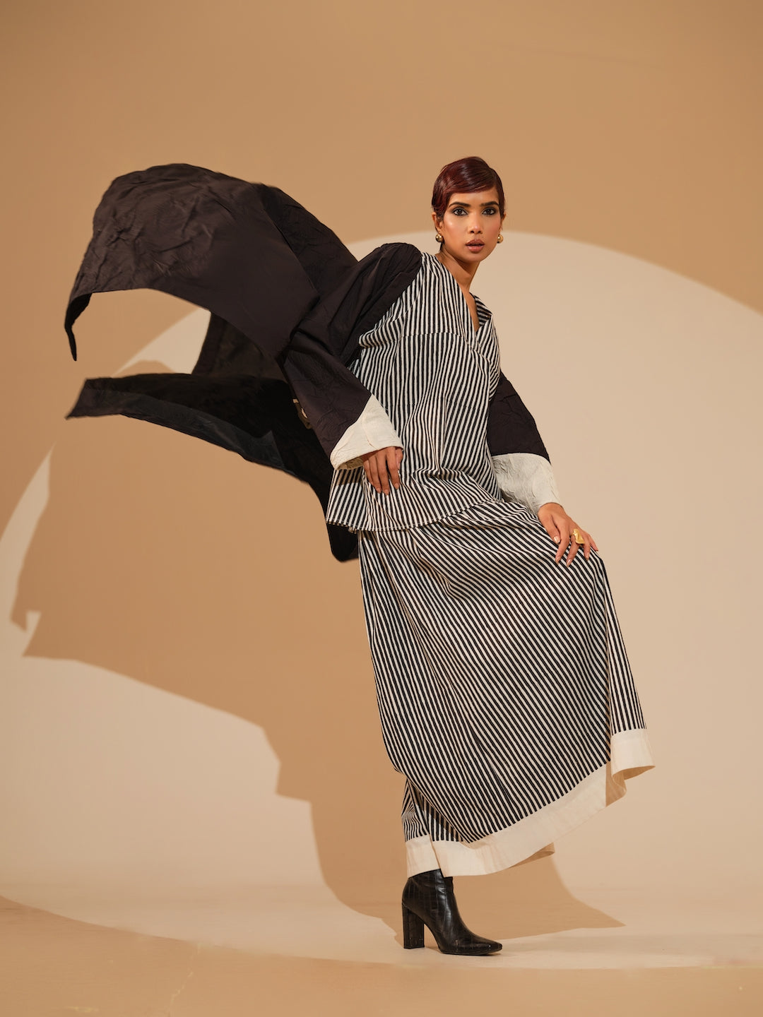 Crafted in hand-crushed silk, this sleeveless ankle-length overlay features a clean, straight silhouette and a soft neckline. The overlay features triangular color blocking. Paired with the hand block printed striped Gale Set.