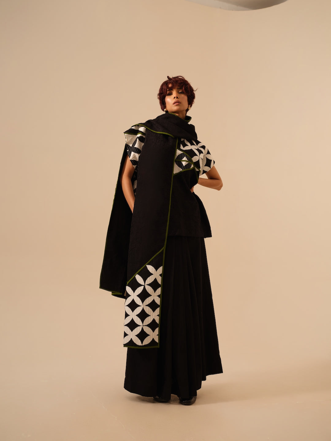 A delicate scarf in signature crushed silk, detailed with hand-stitched floral motifs and edged with a striking contrast — light, textured, and intimate.