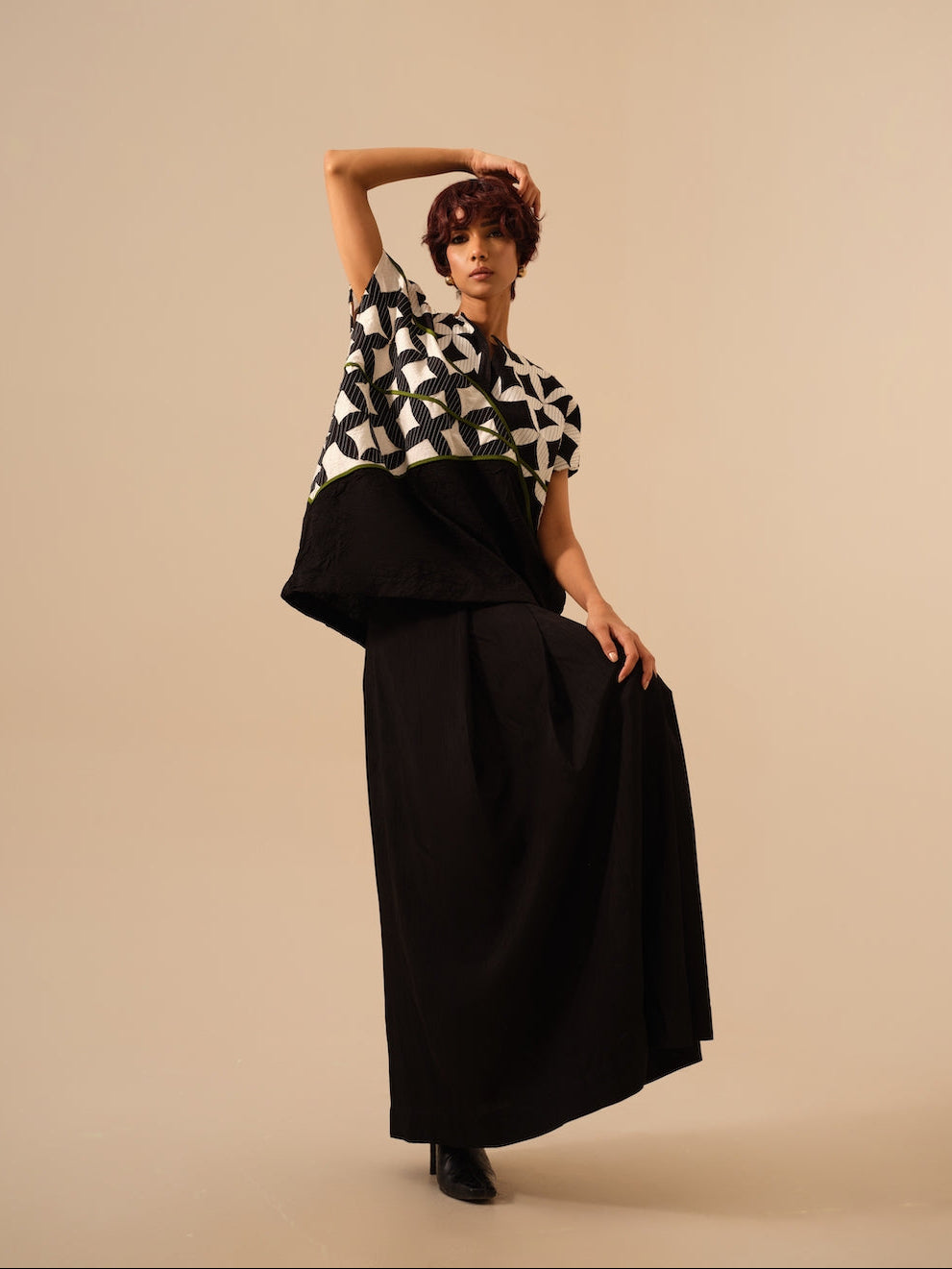 A structured, one-size top defined by bold colour blocking in green and black, offset with striking bindings. Finished with hand-stitched floral motifs — where sharp form meets delicate detail.