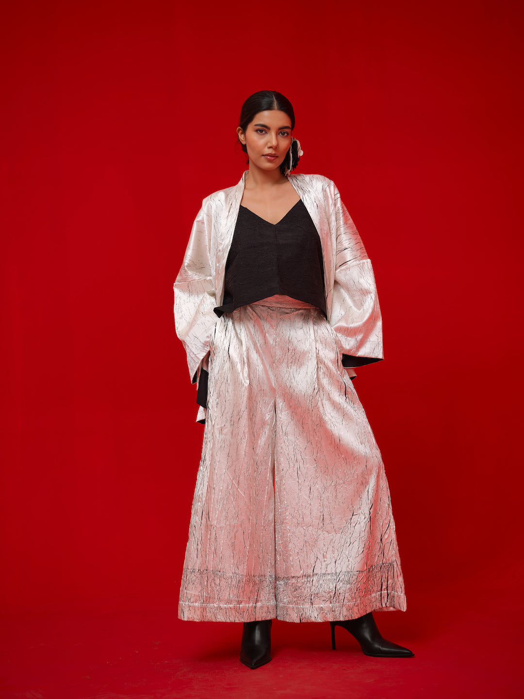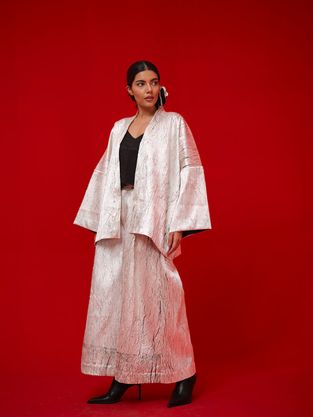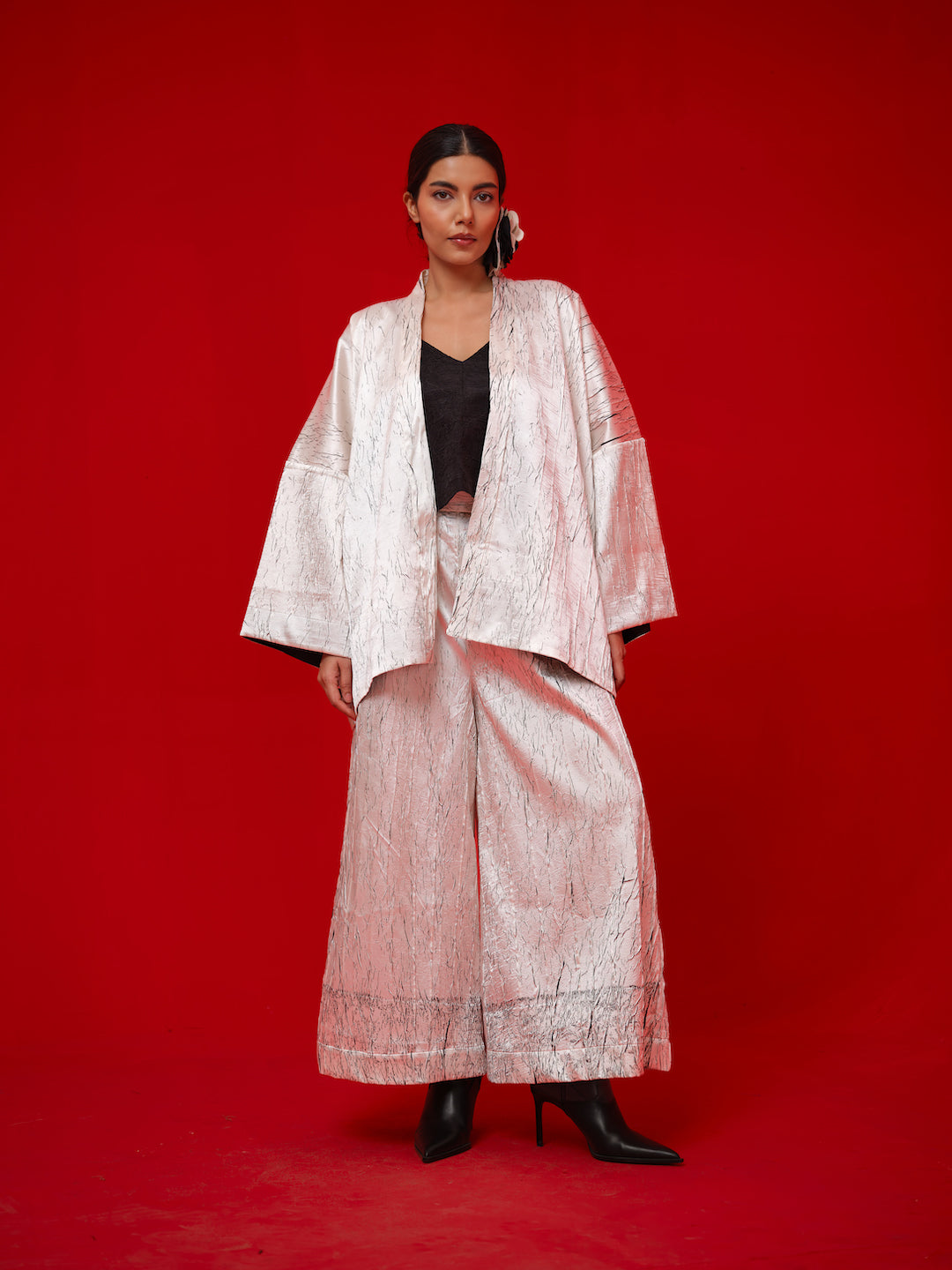 Kimono-style overlay crafted in hand crushed satin with an in-house block print. Designed in an oversized silhouette for an effortless, statement look.