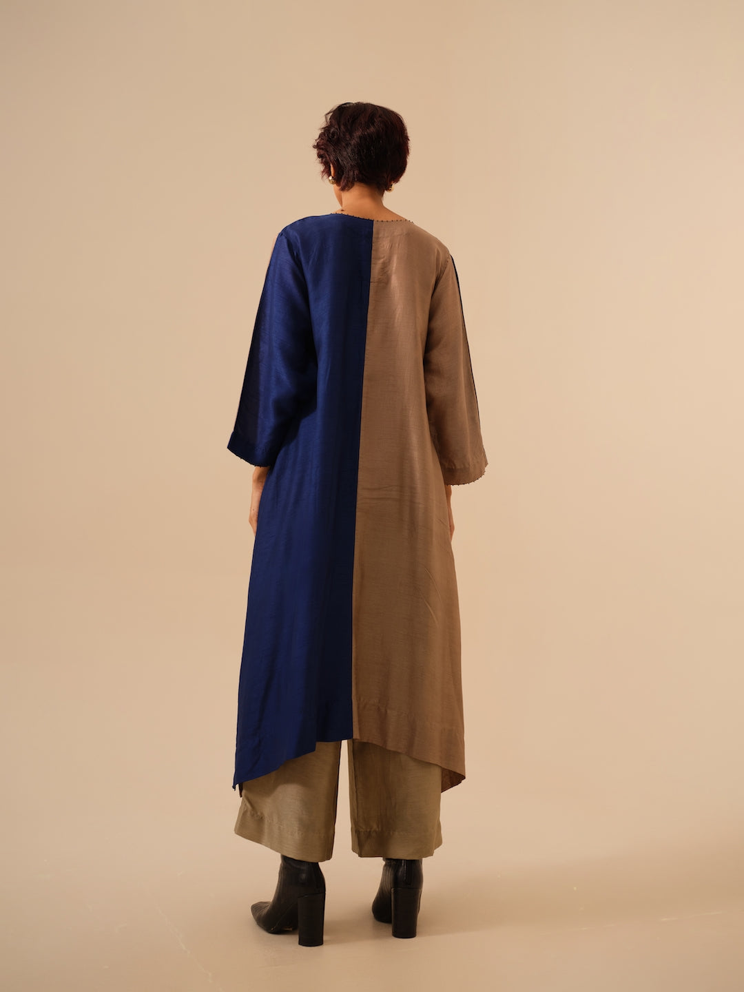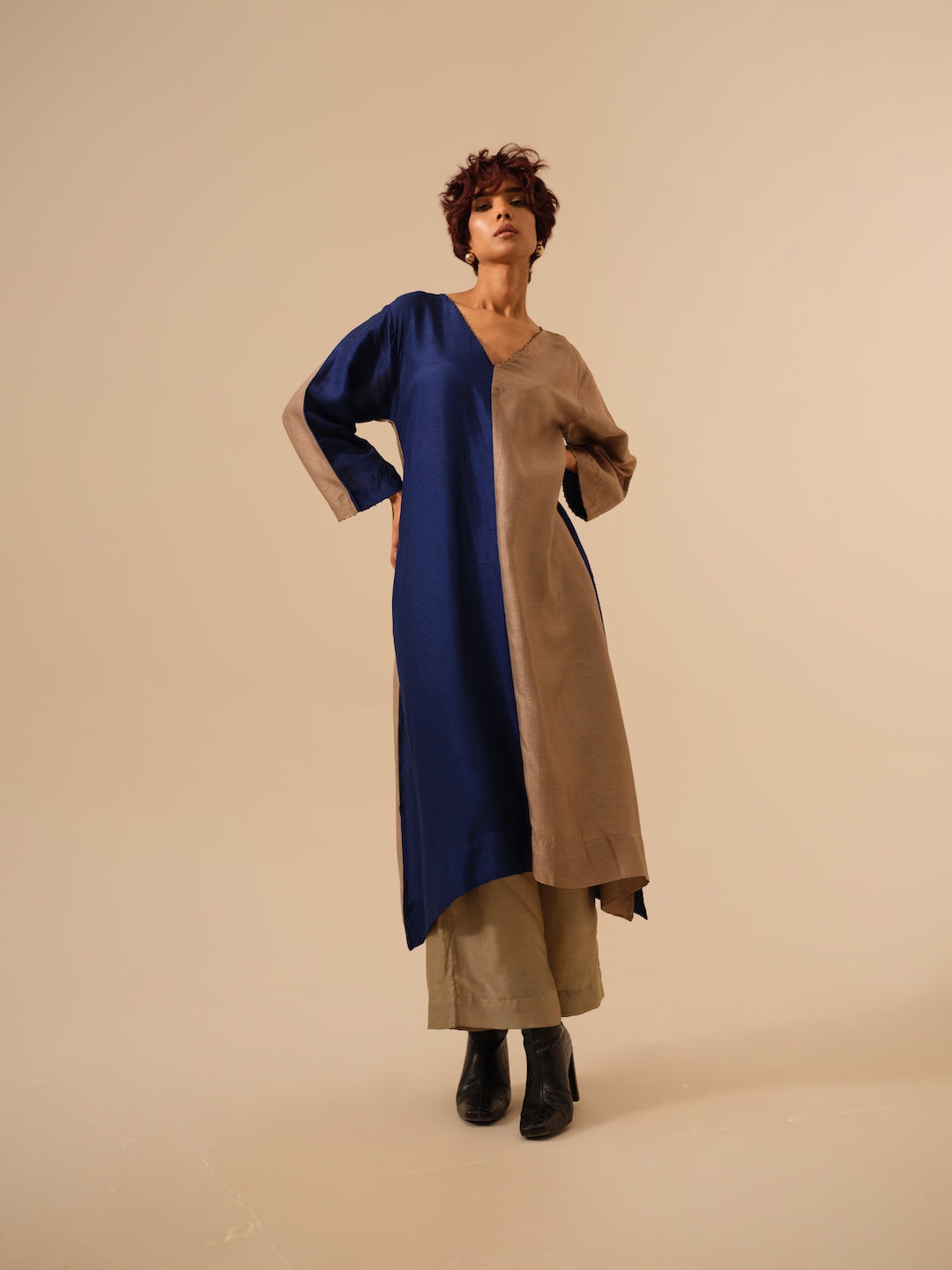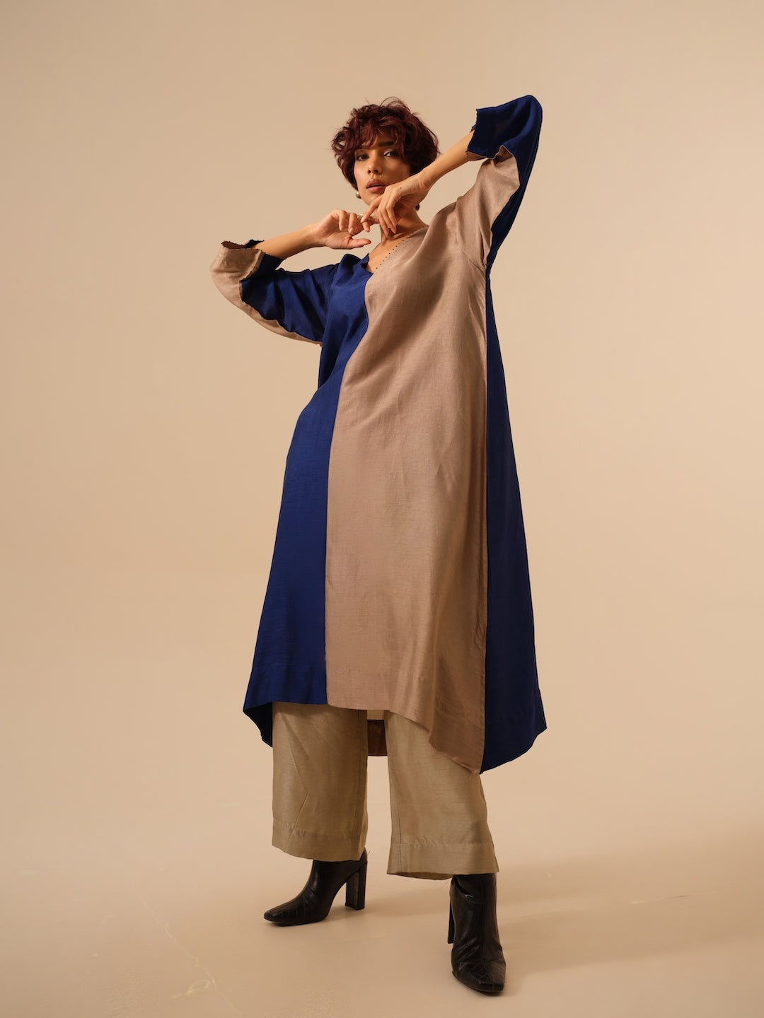 Relaxed tunic made in silk features color blocking with short side slits. Can be worn as a dress.