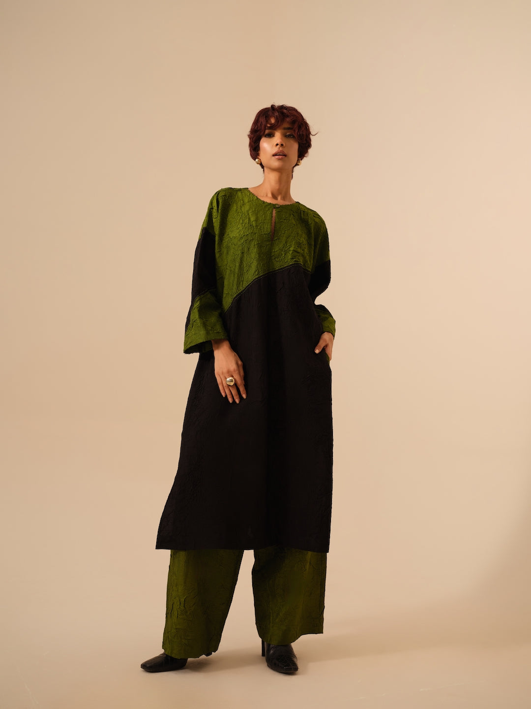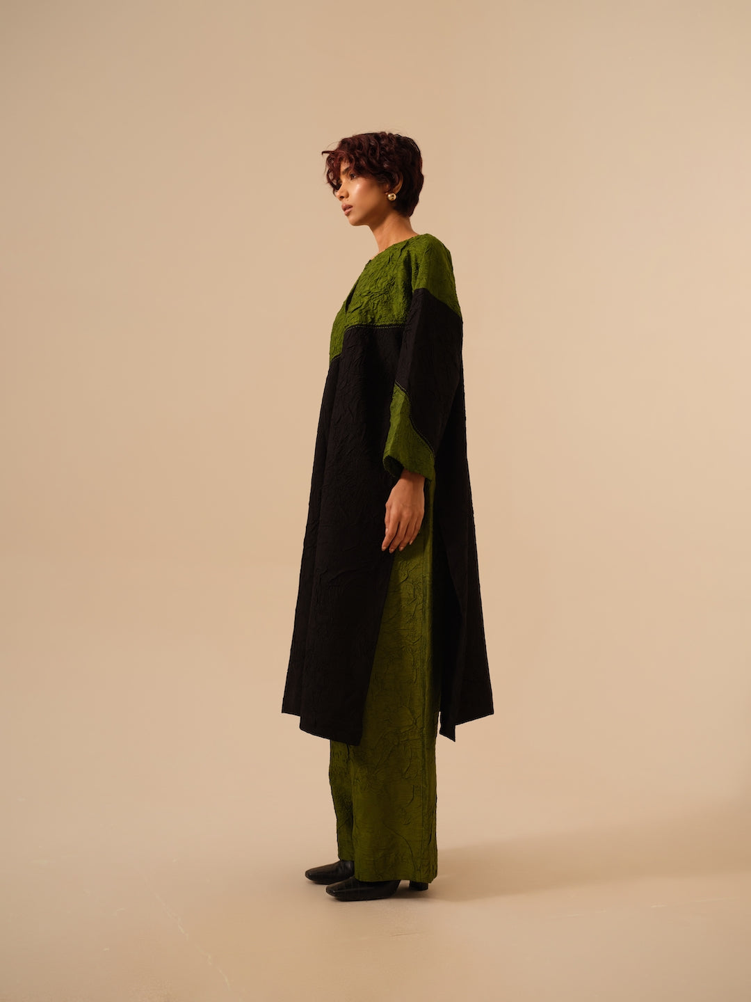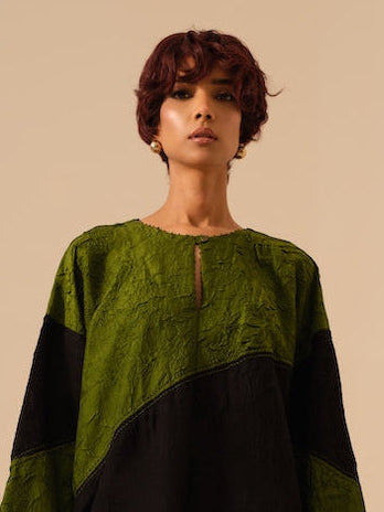 An oversized tunic crafted in hand-crushed silk, designed for ease and movement. The piece features bold color blocking and fine Kantha stitches that trace its surface, celebrating craft through subtle texture and contrast. Effortless yet elevated, it embodies Stoïque’s signature balance of comfort and artistry.