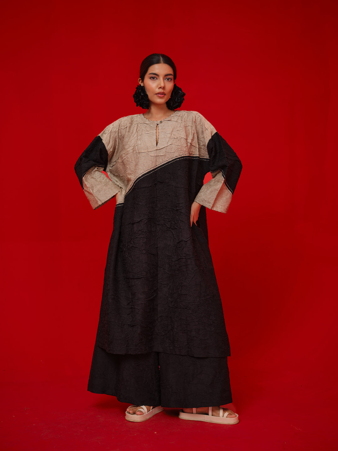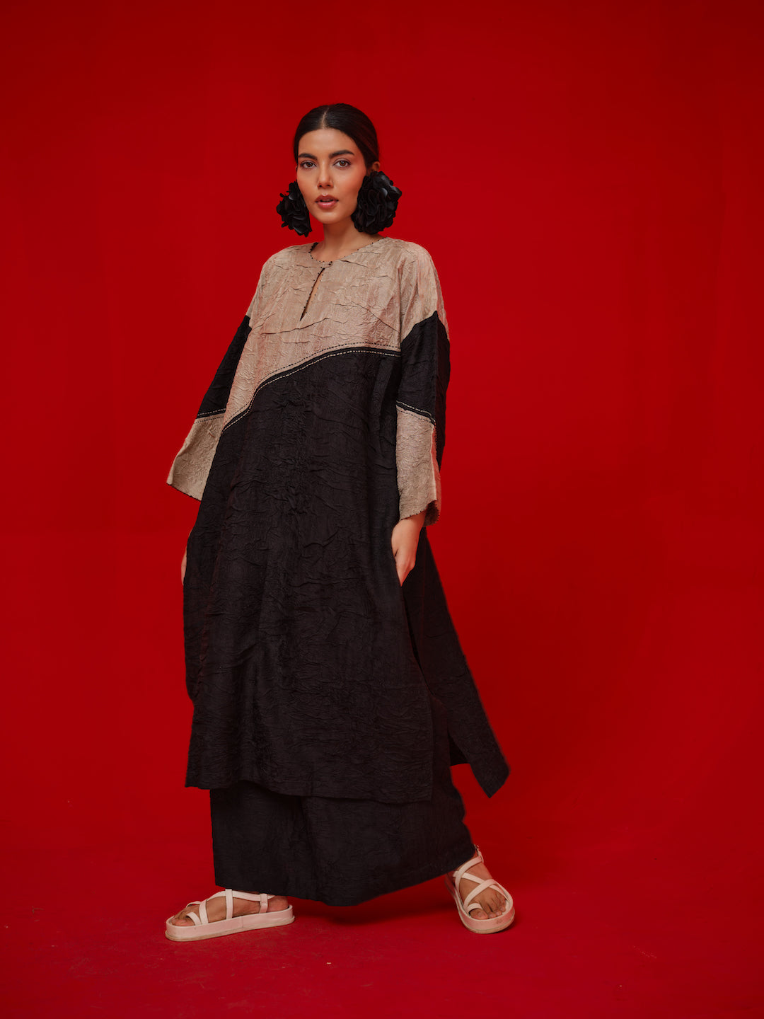 An oversized tunic crafted in hand-crushed silk, designed for ease and movement. The piece features bold color blocking and fine Kantha stitches that trace its surface, celebrating craft through subtle texture and contrast. Effortless yet elevated, it embodies Stoïque’s signature balance of comfort and artistry.