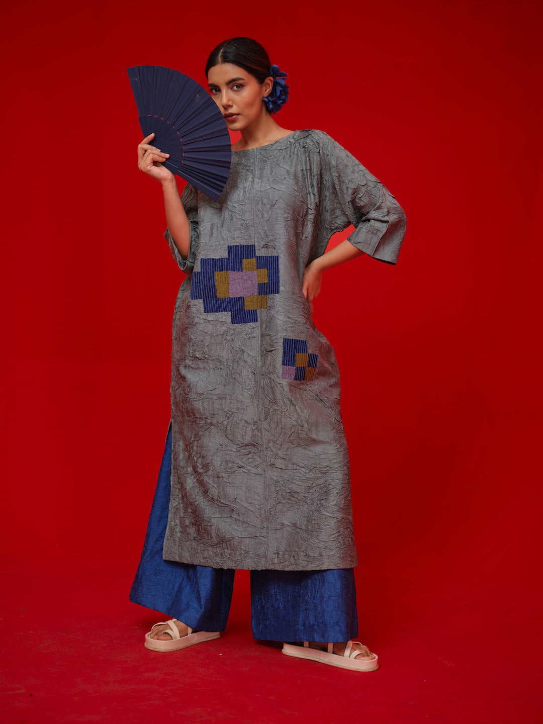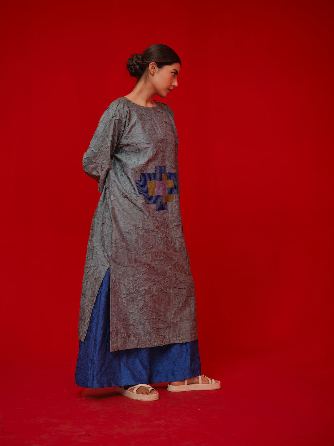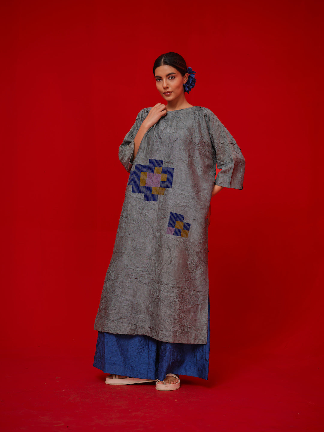 Relaxed tunic crafted in hand crushed silk crushed in-house. Designed with a hand cut pixelated floral applique for a modern artisanal touch