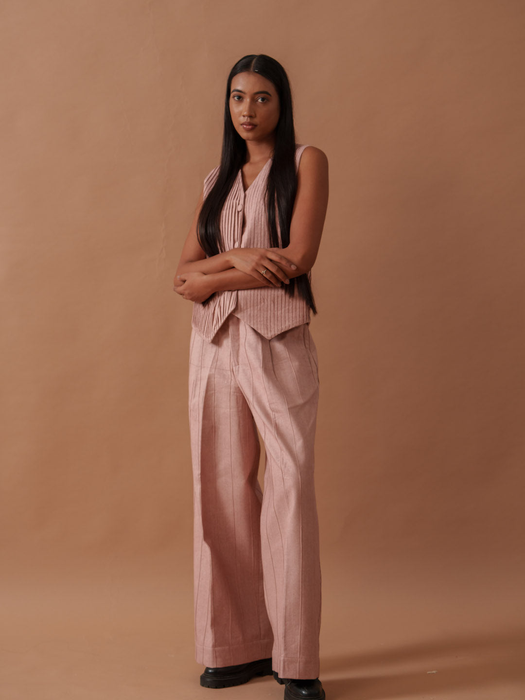 Meticulously crafted tailored trousers featuring hand sewn pin-tucks. Exude confidence and embrace a structured look that lengthens your silhouette.
