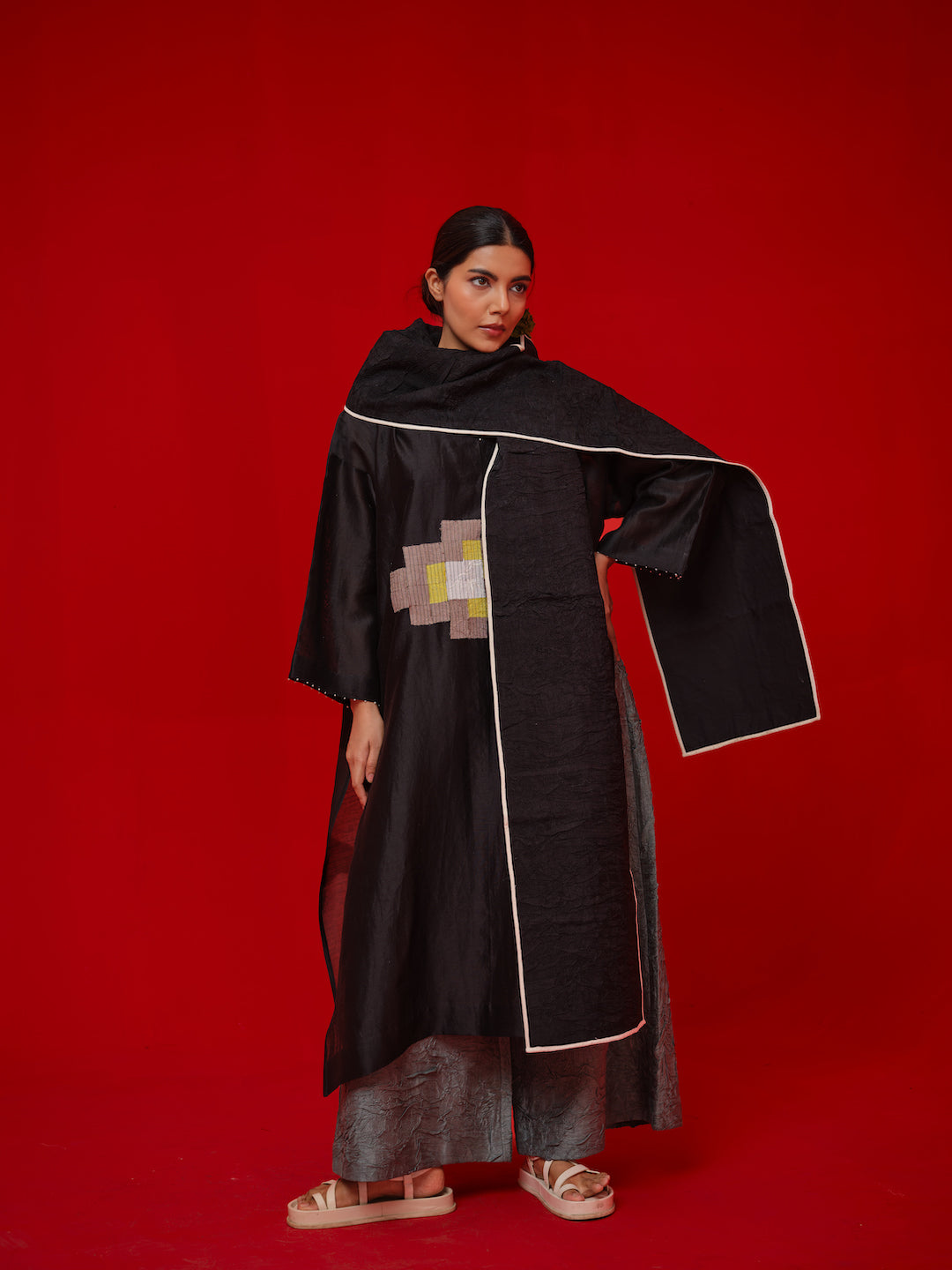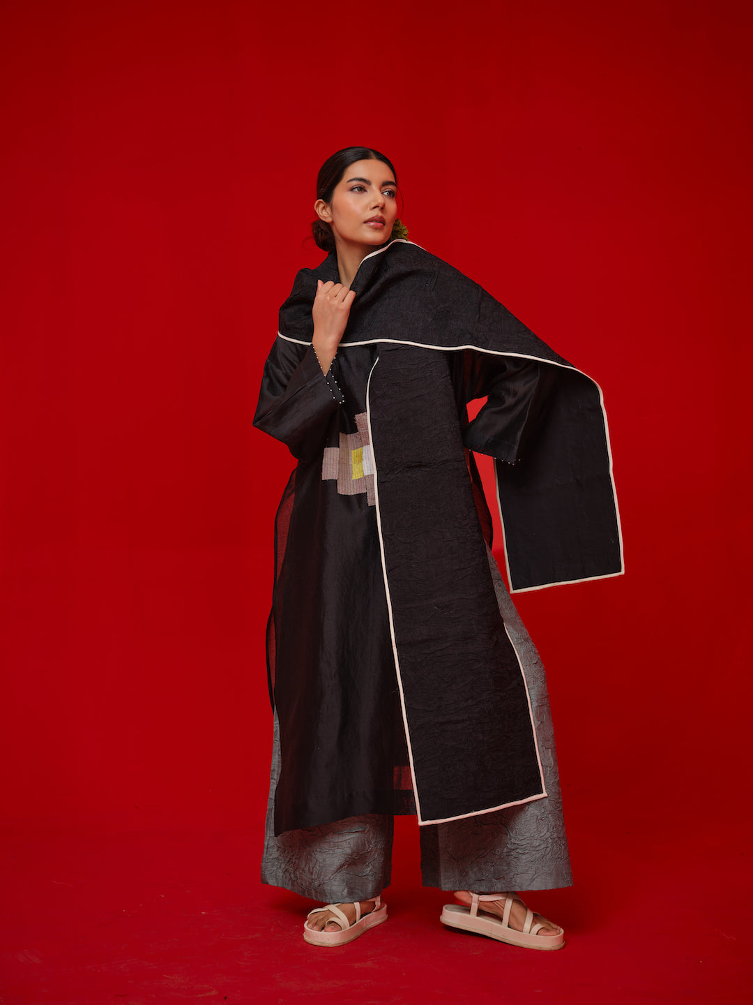 A scarf crafted in hand-crushed silk, crushed in-house. Finished with contrasting edge binding for a clean, refined look.