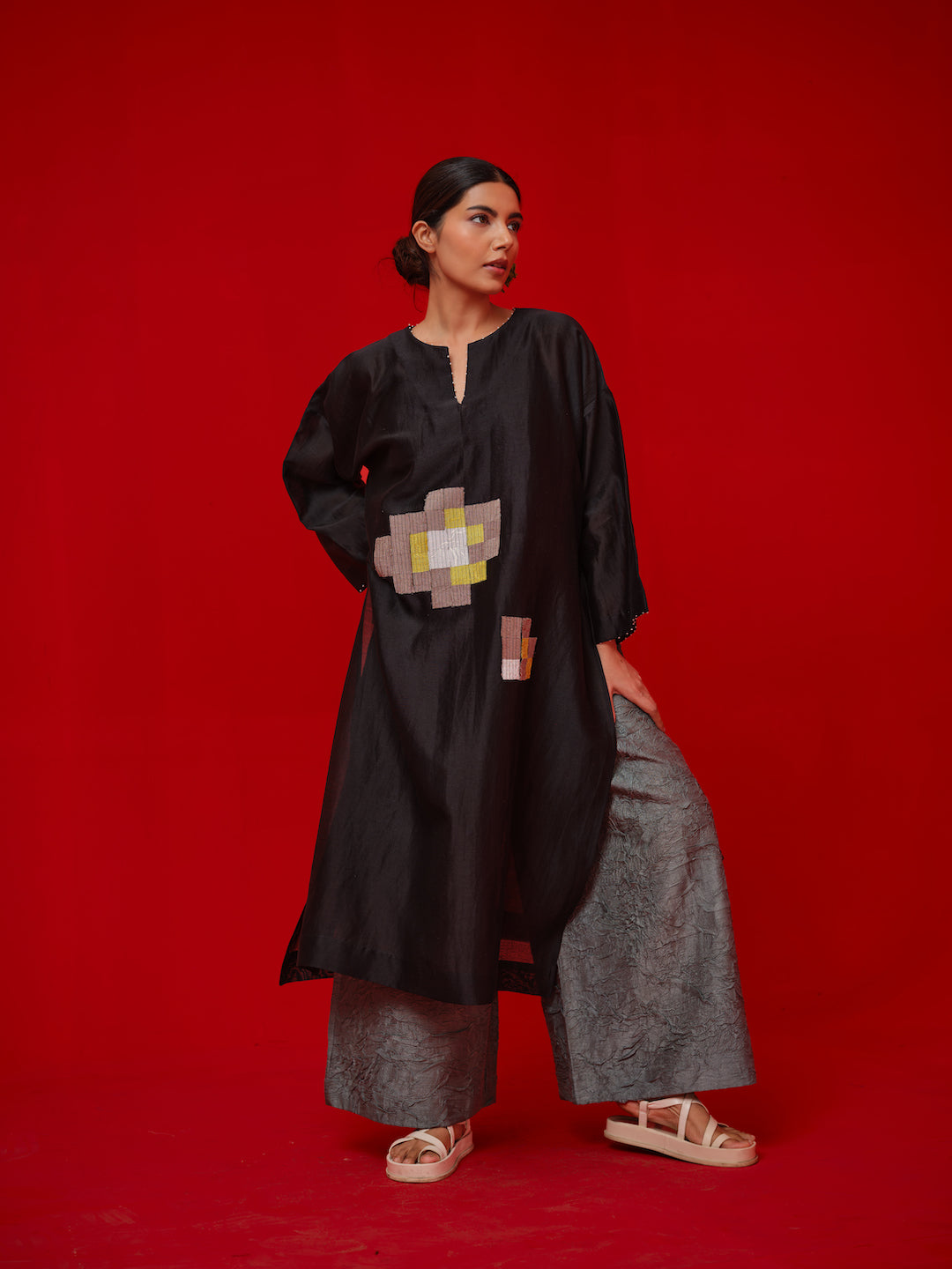 An One-size tunic crafted in Chanderi. Designed with hand-cut, contrasting appliqué motifs in the centre and finished with beadwork detailing on the neckline and sleeves.