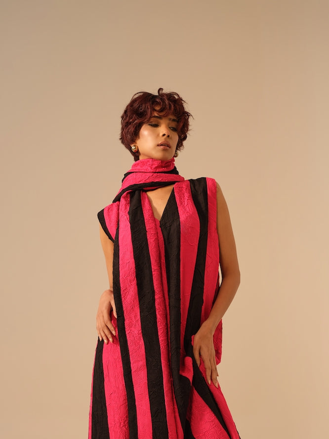 A two-and-a-half-meter-long scarf crafted in hand-crushed silk, created in-house by our team of artisans. The piece features vertical patchwork detailing that echoes the textures and rhythm of our twin dress. Lightweight yet tactile, it drapes effortlessly adding depth and elegance to any ensemble.