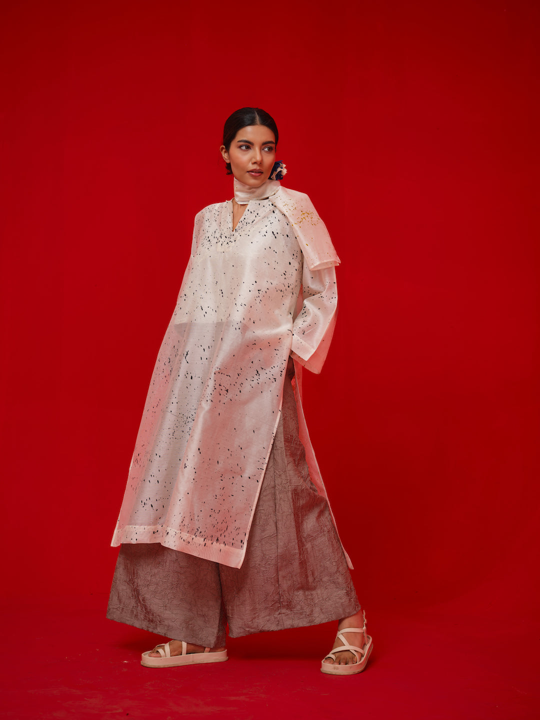 Relaxed-fit pants crafted in hand-crushed silk, crushed in-house. Designed with a flat front, elasticated waistband, and two side pockets for ease and comfort.