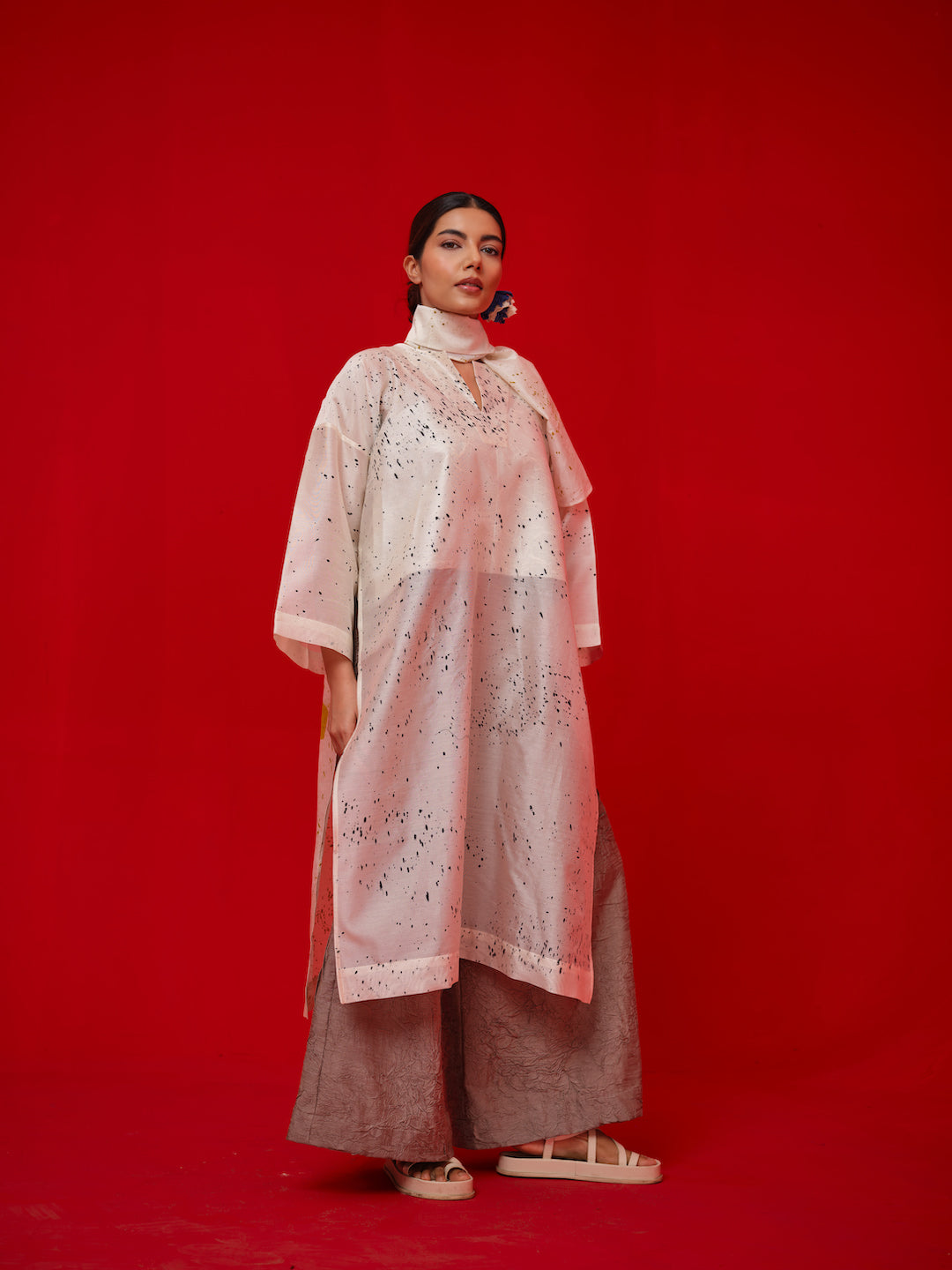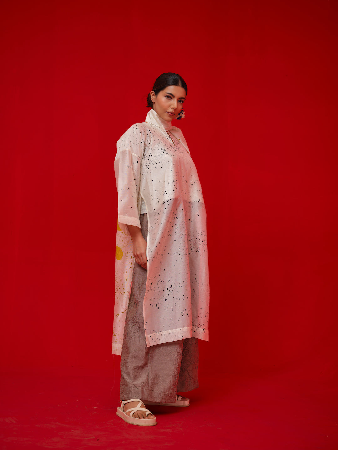 A Relaxed, one-size tunic crafted in Chanderi. Handcrafted with unique hand-painted and hand block-printed details for an artisanal finish.